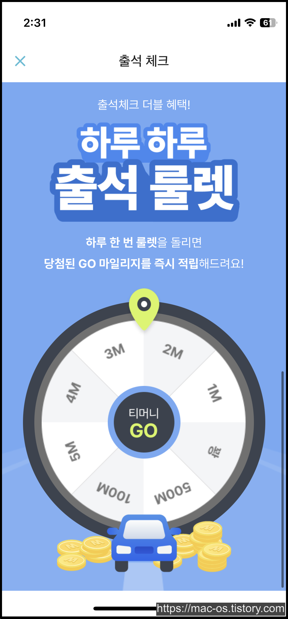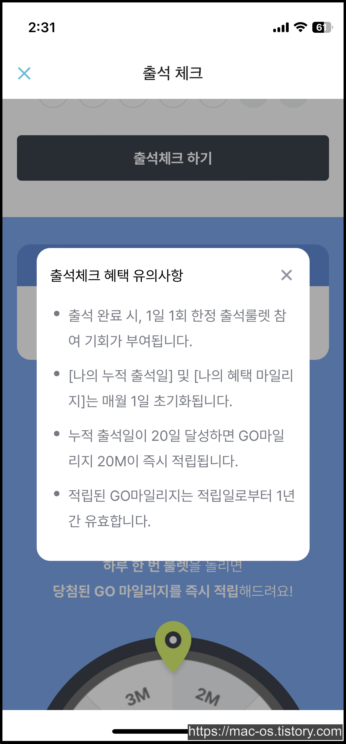 - 출석 룰렛을 돌리고 매일 최대 500마일리지 획득 가능(누적 출석일 20일 달성 시 20마일리지 추가 적립)