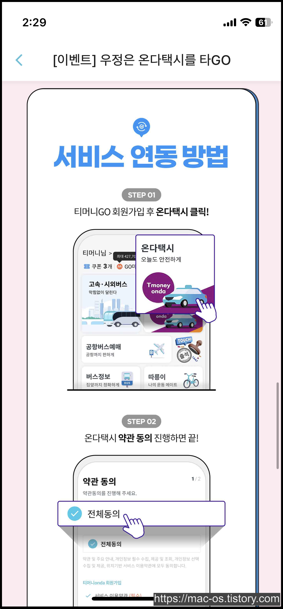초대코드를 입력한 신규 회원이 티머니GO 온다택시 신규가입(서비스 연동)하는 방법은 다음과 같습니다. 우선 티머니GO 홈 화면에서 온다택시를 클릭하고 온다택시 약관 동의를 진행하면 됩니다.