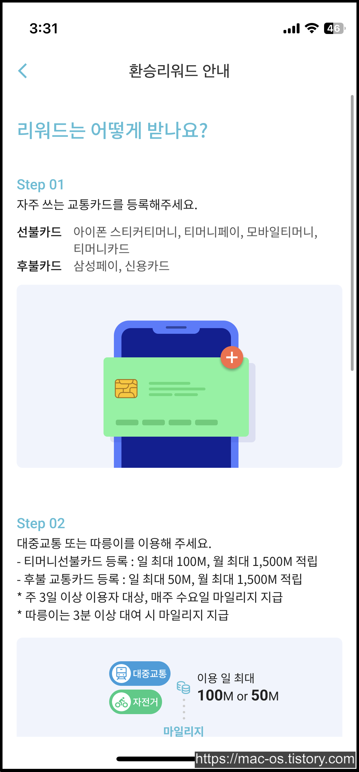 대중교통 또는 따릉이를 이용할 때에는 티머니 선불카드를 등록하면 매일 100원이고, 후불 교통카드를 등록하면 매일 50원이니 참고하시기 바랍니다.