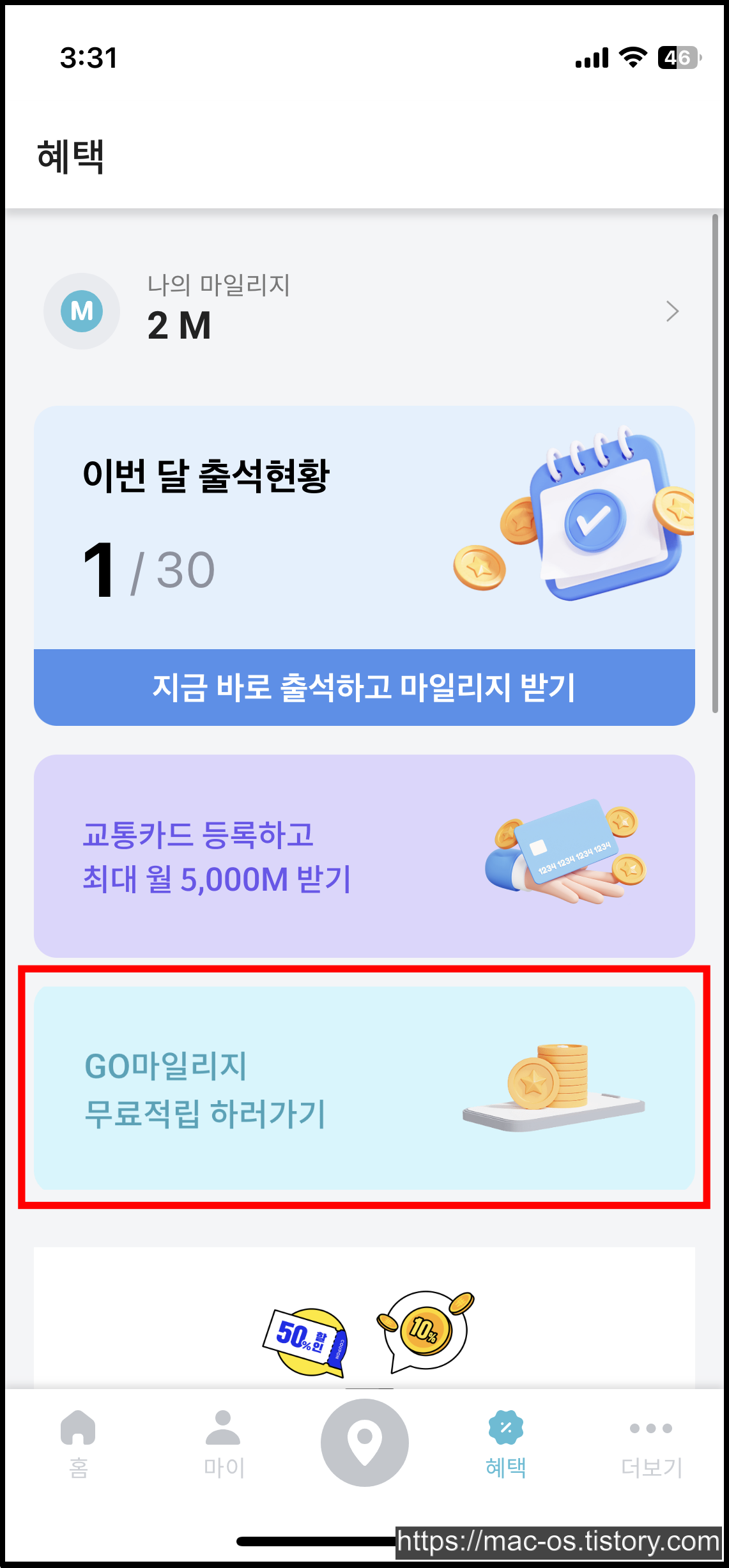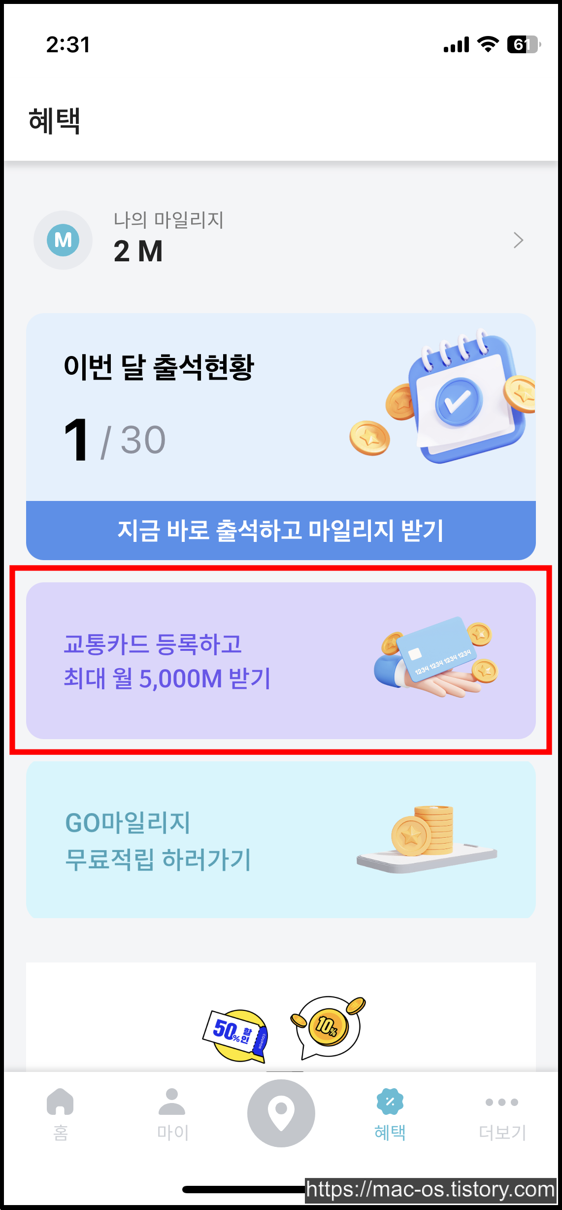 혜택에서 교통카드 등록하고 최대 월 5000M 받기 배너를 터치하면 대중교통을 이용하고 월 5천원을 받을 수 있습니다. 대중교통 또는 따릉이를 이용하면 매일 100원, 대중교통 환승 시 200원 추가 적립이 있는데요.