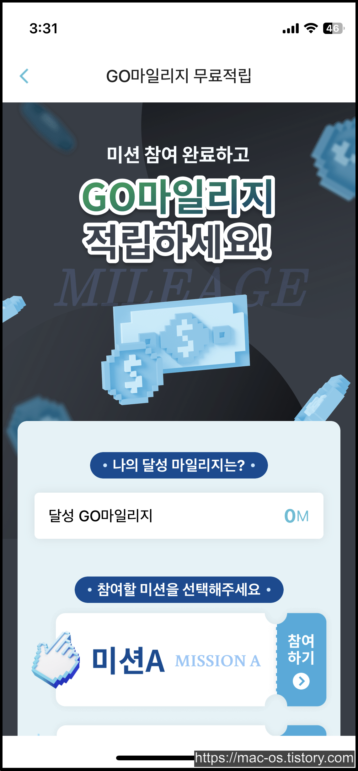 GO마일리지 무료적립 하러가기를 누르면 미션A와 미션B가 있습니다.