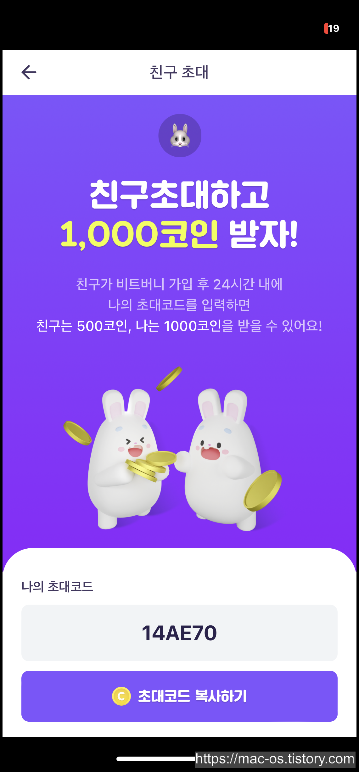 비트버니에서 친구초대 이벤트를 진행중이다. 친구가 비트버니 가입 후 24시간 내에 나의 초대코드를 입력하면 친구는 500코인, 나는 1000코인을 받을 수 있다.