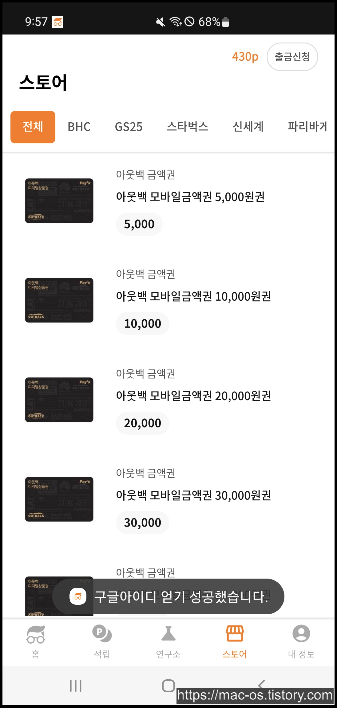 적립한 포인트는 스토어에서 1:1 비율로 상품권이나 기프티콘, 출금신청에 사용할 수 있습니다.
