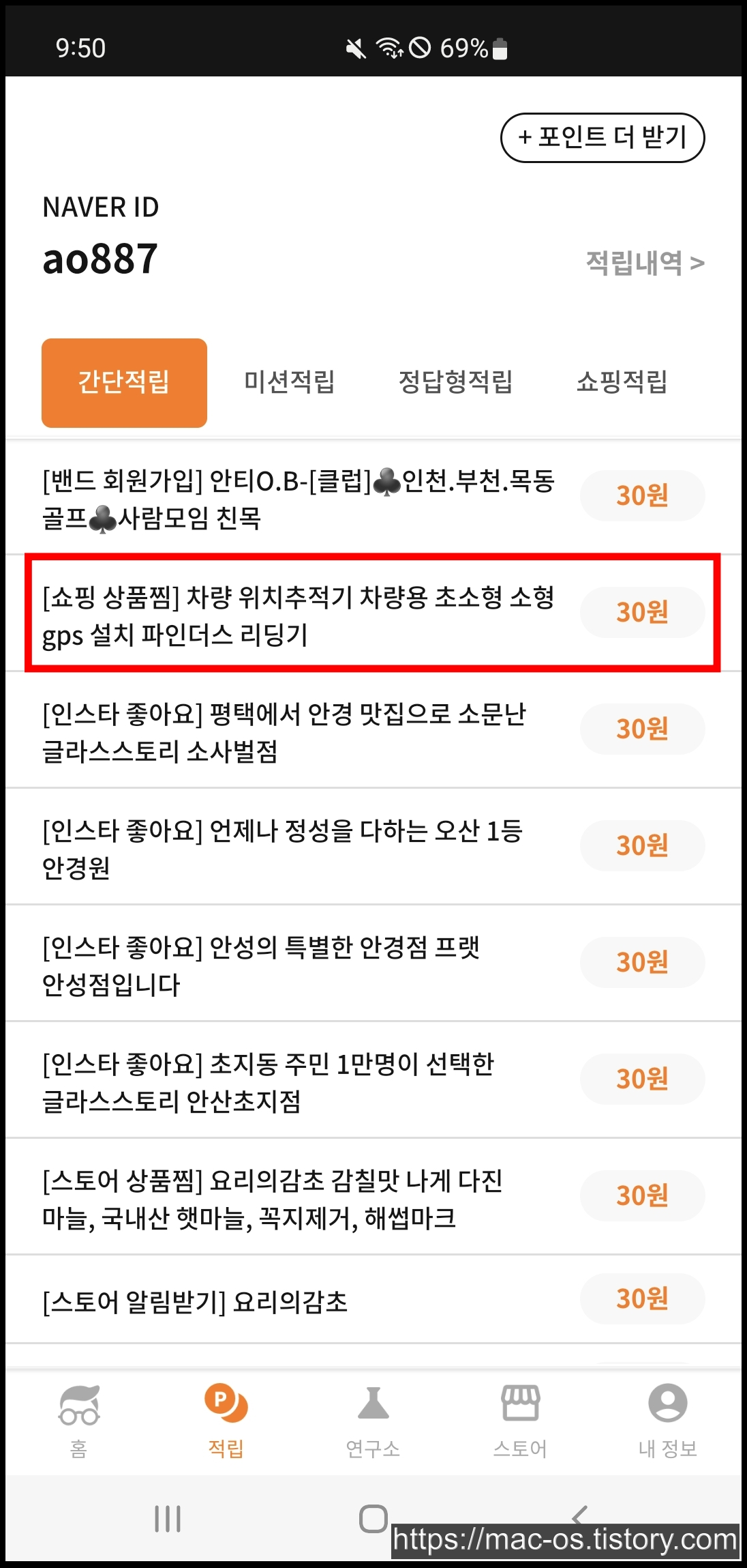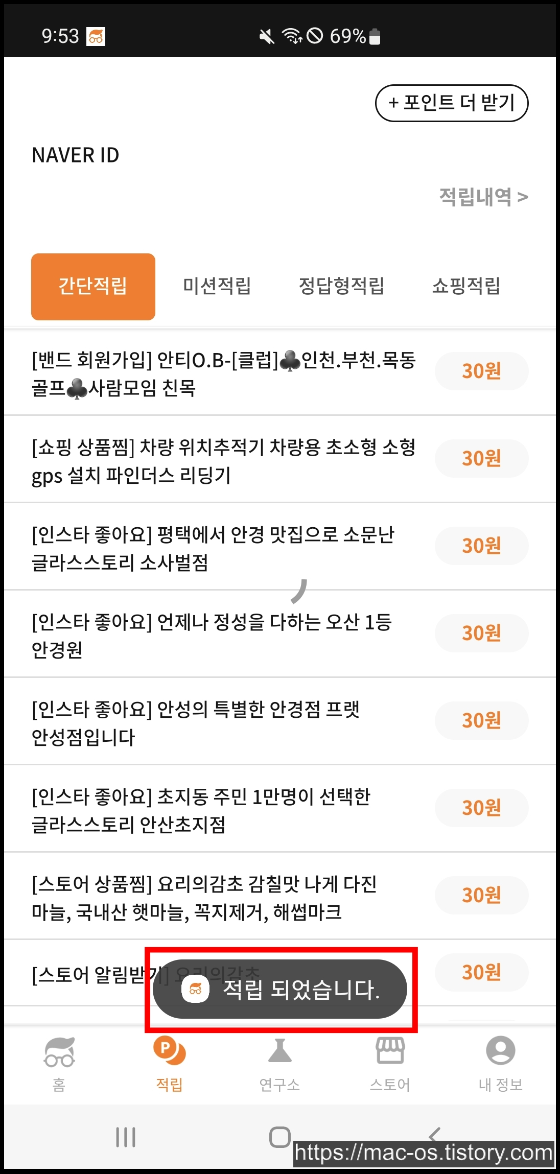 하단의 적립을 터치하면 네이버 아이디 입력창이 나오는데 여기에 네이버 아이디를 입력하고 미션을 선택하면 됩니다.