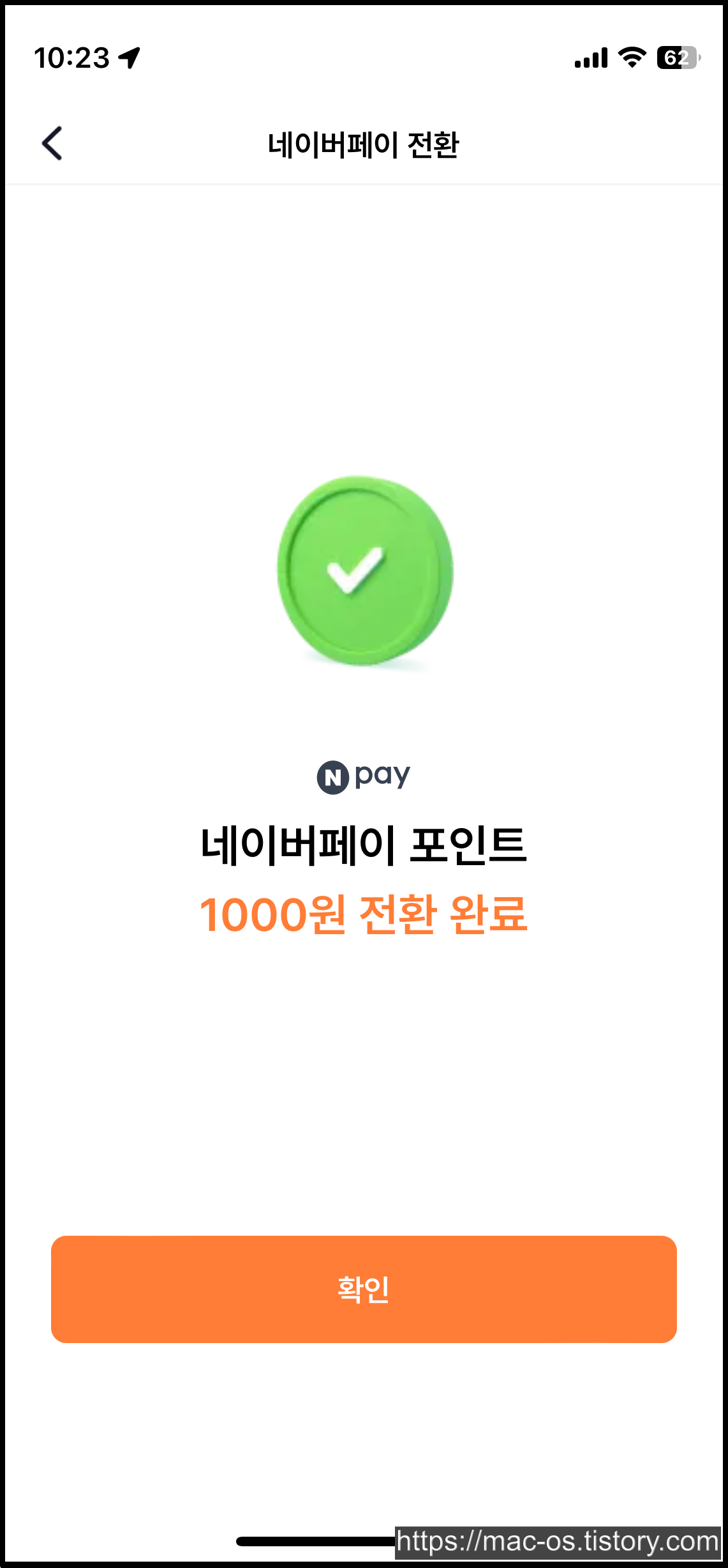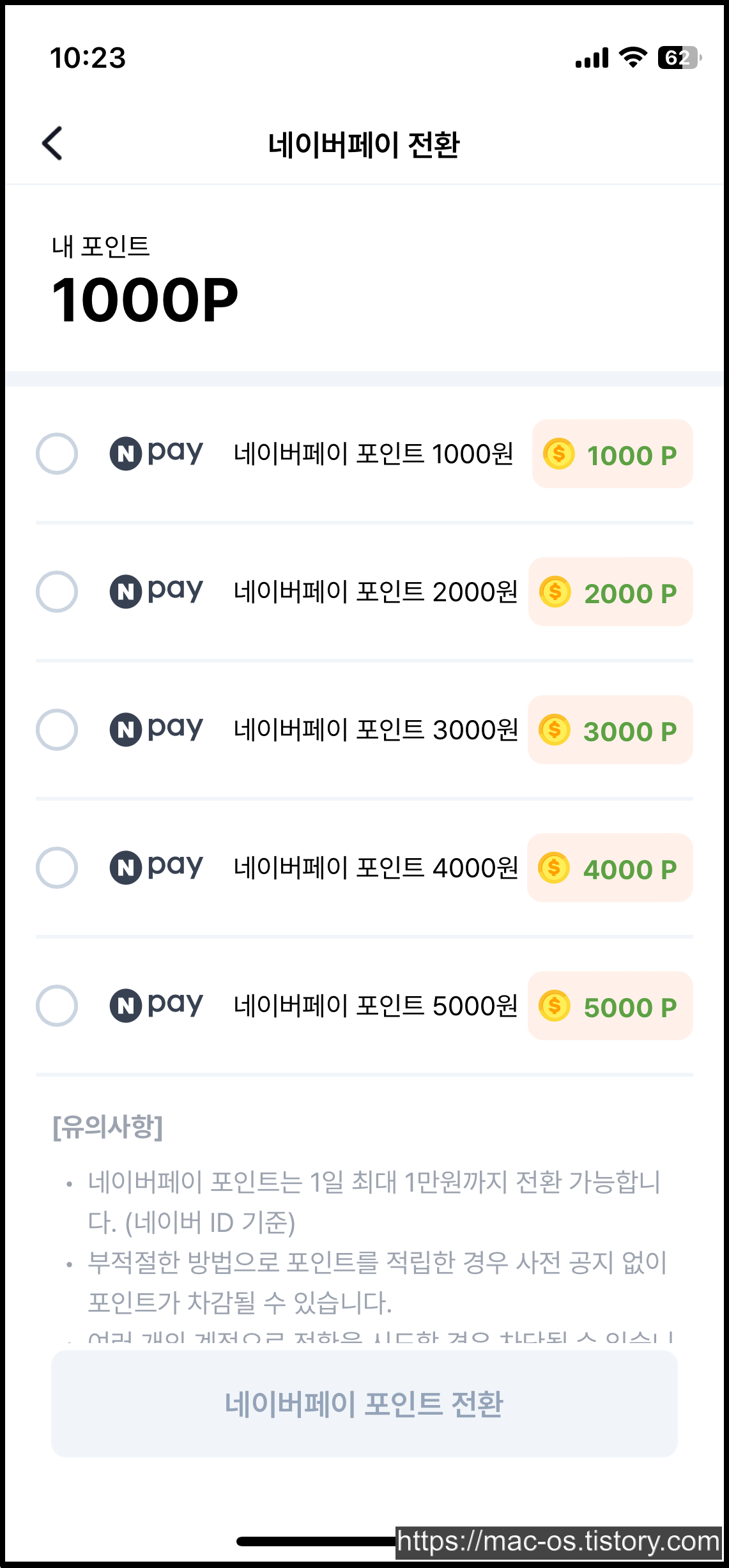 전환 버튼을 누르면 네이버 로그인 창이 나오는데 여기서 로그인을 해주면 바로 1000원이 적립됩니다.