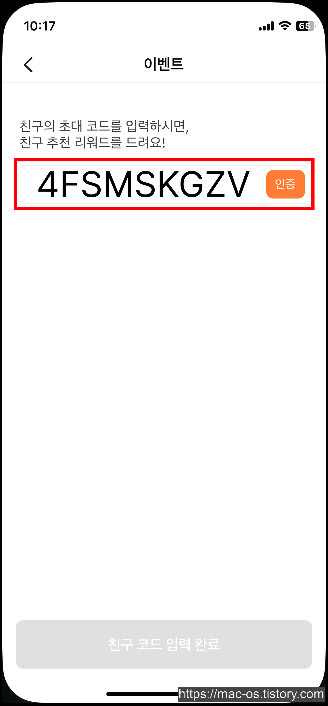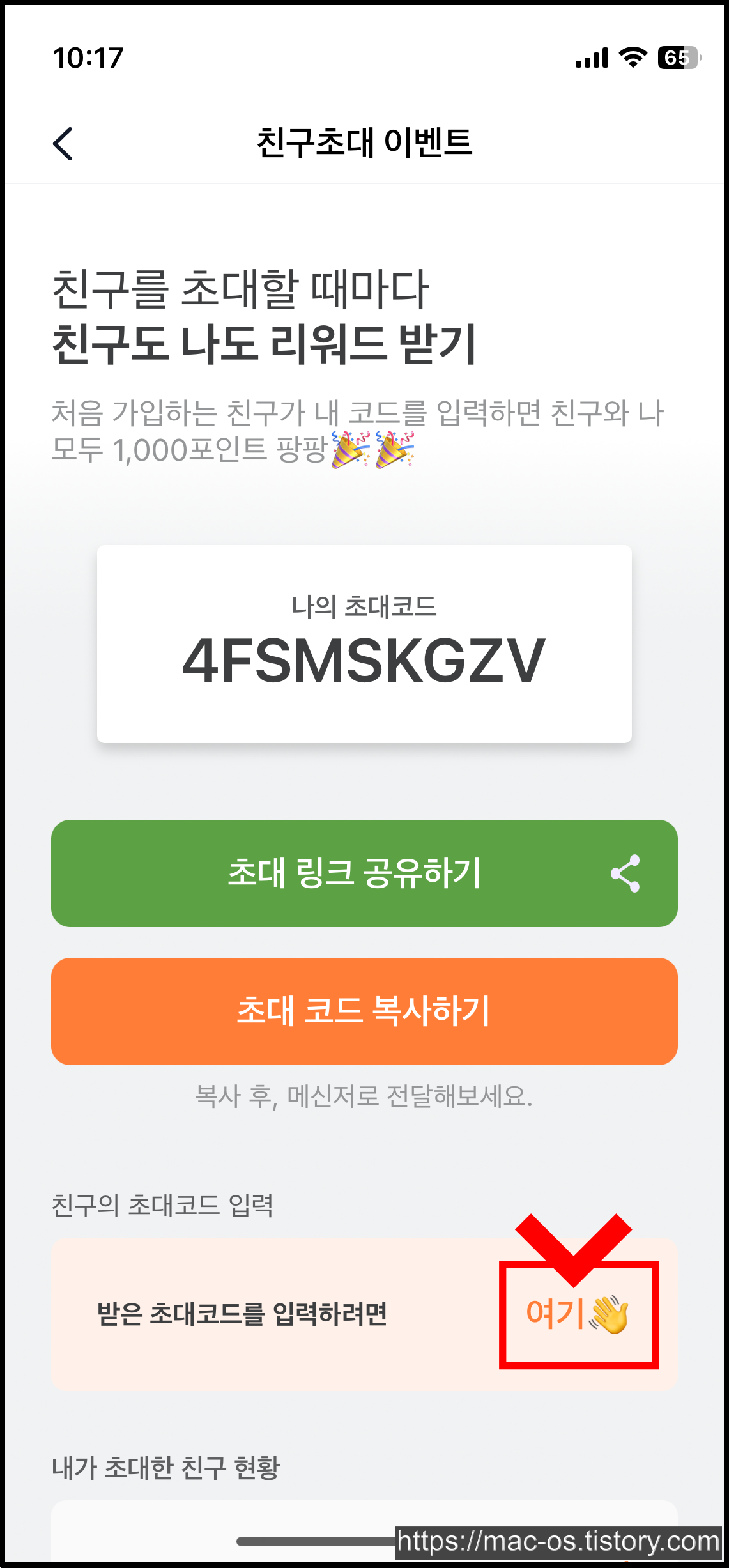 '친구도 나도 리워드 받기'를 터치하면 친구초대 이벤트 페이지로 이동하게 되는데, '받은 초대코드를 입력하려면'에서 [여기]를 터치합니다.