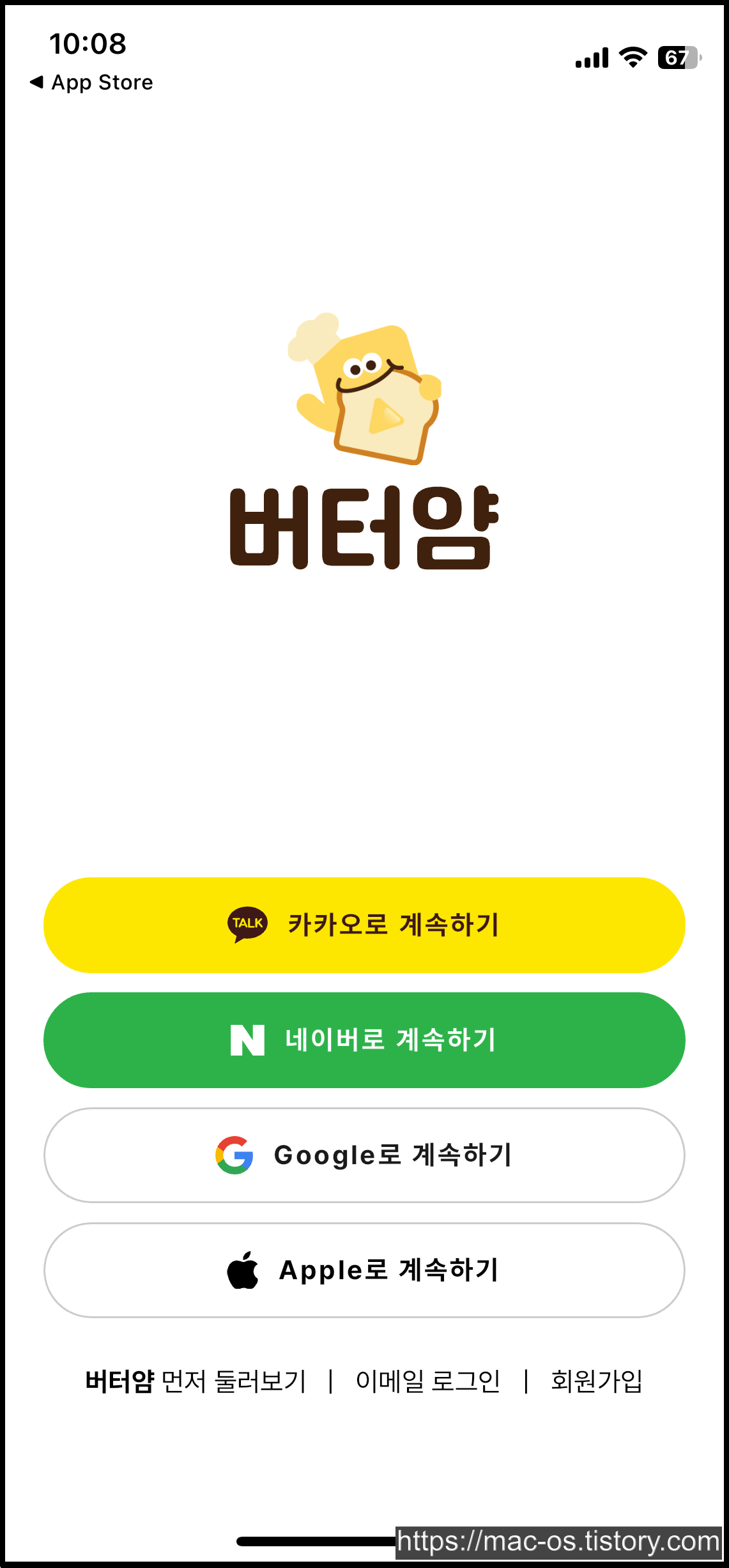 버터얌 앱은 구글 플레이 스토어와 애플 앱스토어에서 설치할 수 있습니다. 카카오, 네이버, 구글, 애플 계정으로 시작하거나 이메일로 회원가입하시면 됩니다.