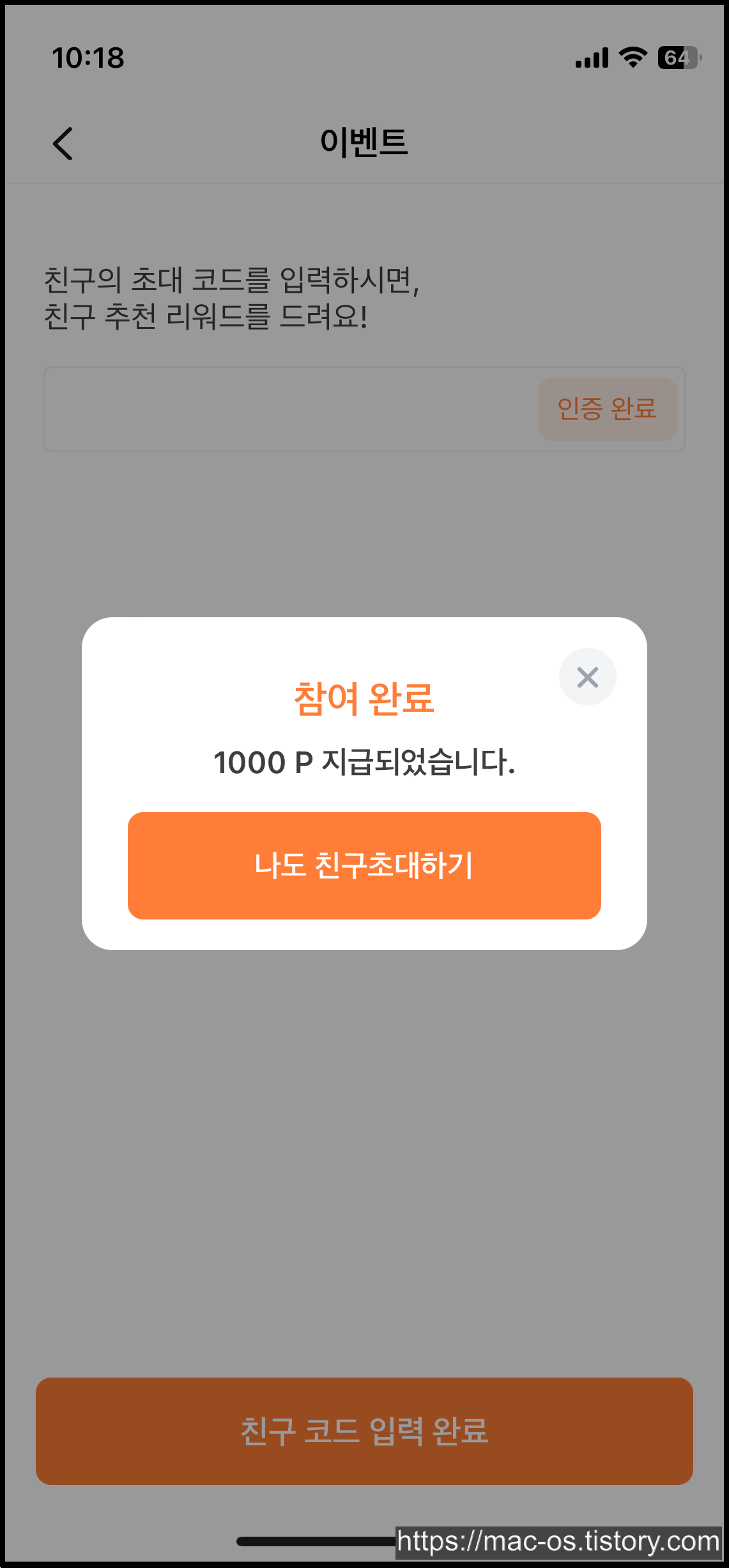 회원가입을 하면 왼쪽 사진처럼 친구초대 이벤트 배너가 나옵니다. 여길 터치하면 되는데, 만약 닫기를 누르셨다면 우측 하단의 주황색 버튼을 눌러주세요.