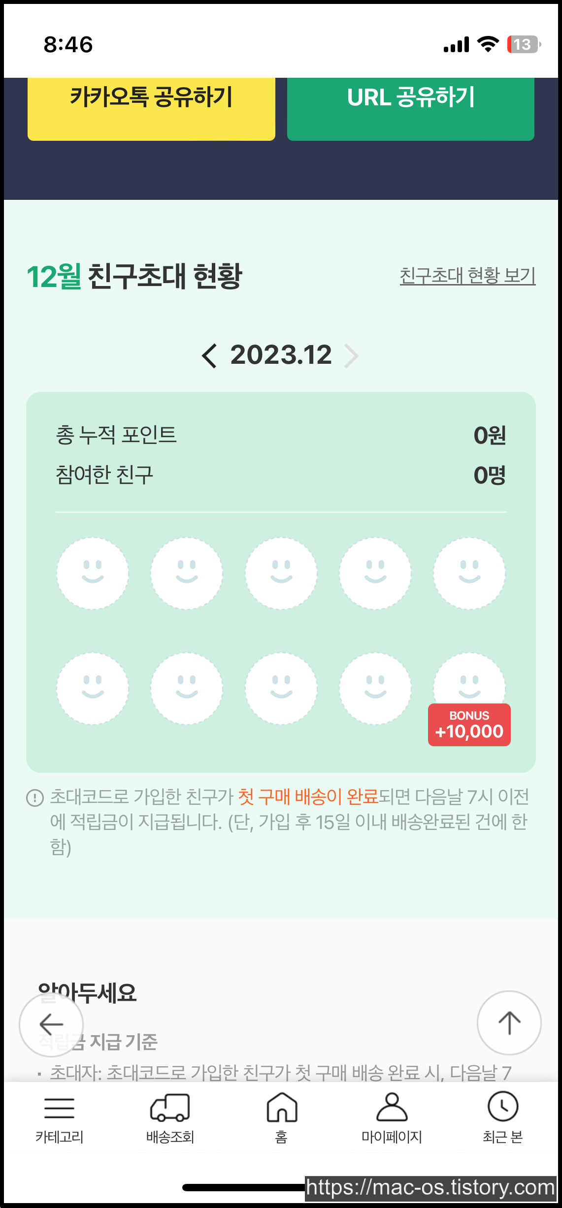 초대한 친구가 첫 구매배송 완료시 다음날 초대자에게