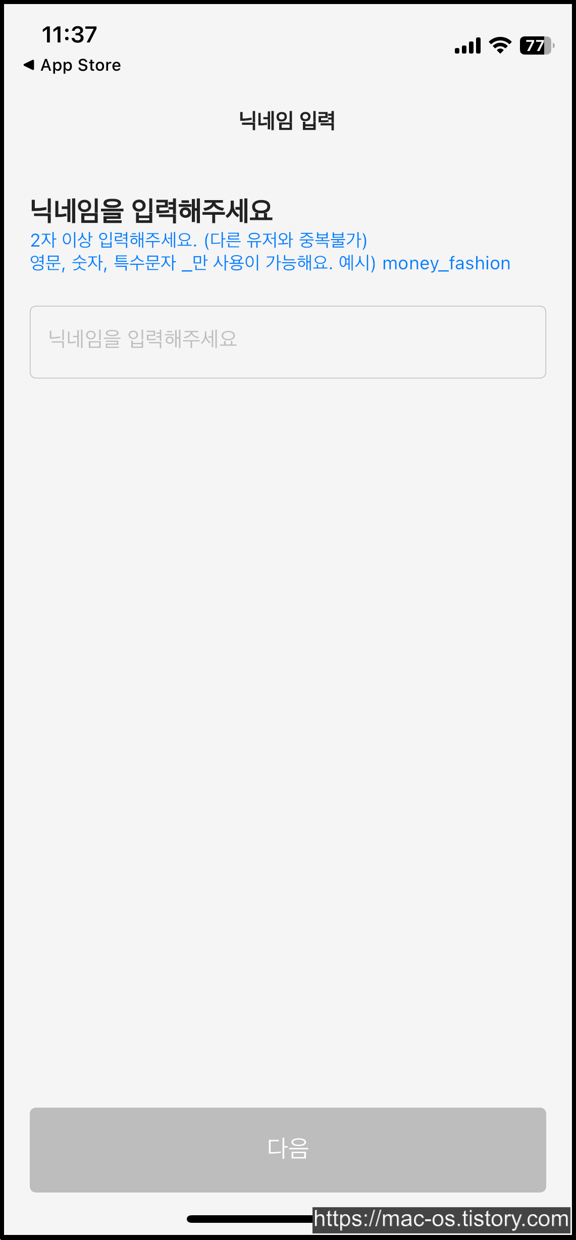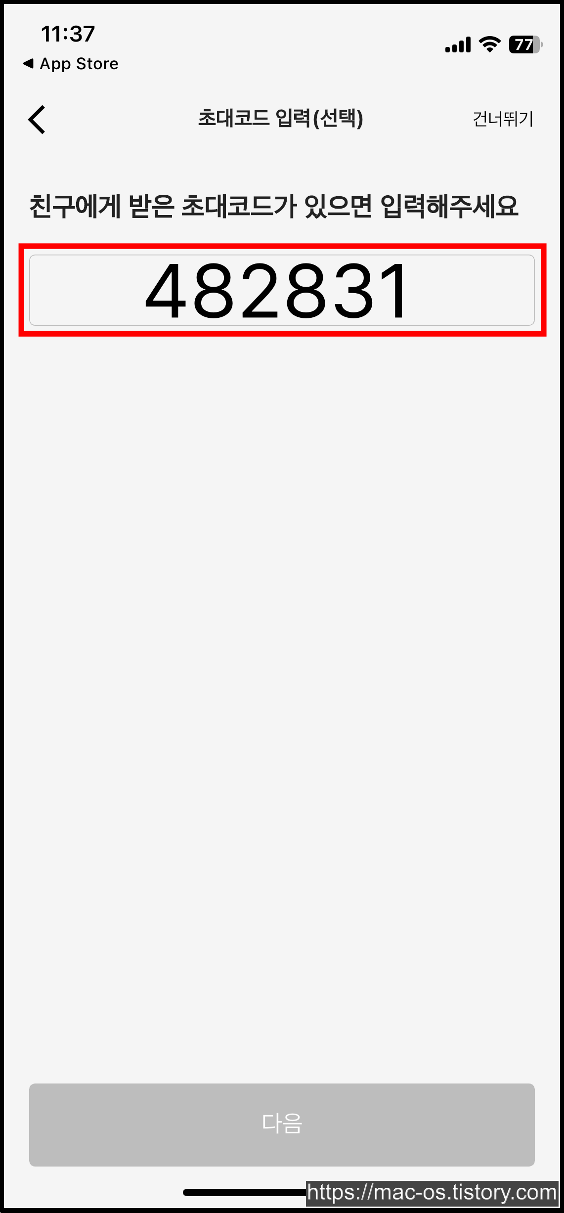 사용자 별칭을 입력하면 친구에게 받은 초대코드를 입력하는 페이지가 등장합니다. 여기서 482831를 복사해서 입력하시면 2000포인트를 받고 시작할 수 있습니다.