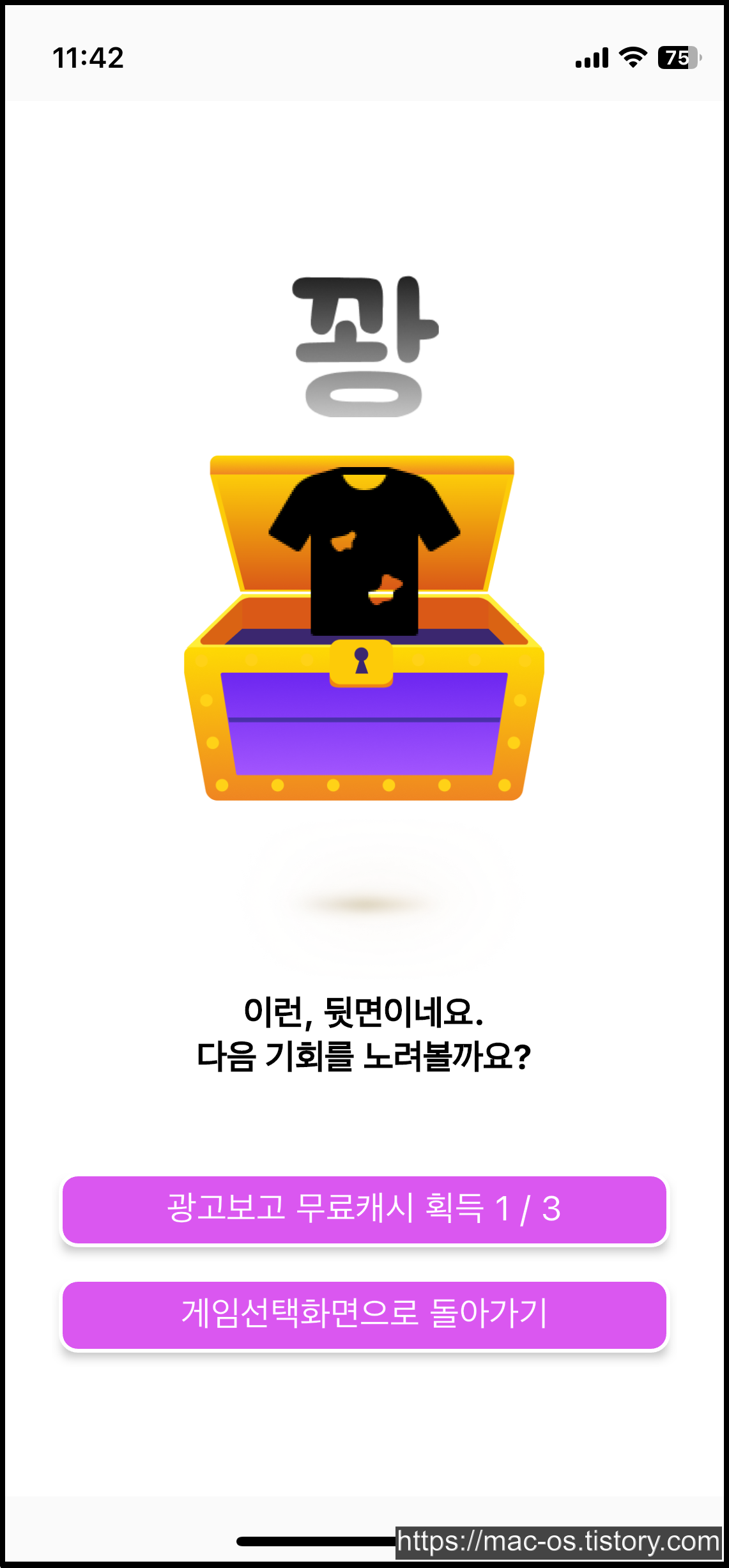 20초 가량의 광고 영상을 시청하면 보물상자를 열 수 있는 열쇠가 주어집니다. 열쇠로 상자를 열면 꽝 또는 캐시가 등장하는데 최대 얼마나 등장하는지는 잘 모르겠네요. 하루에 최대 3번만 가능합니다.