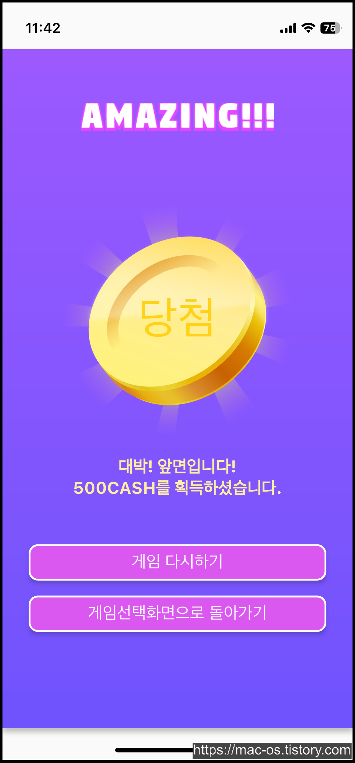 동전을 클릭하면 250캐시가 소모되고 앞면 또는 뒷면으로 동전이 던져집니다. 동전 앞면이 나온 경우 500캐시를 받아 250캐시의 이익을 볼 수 있고 동전 뒷면이 나오면 그대로 250캐시가 손해보는 미니 게임입니다.