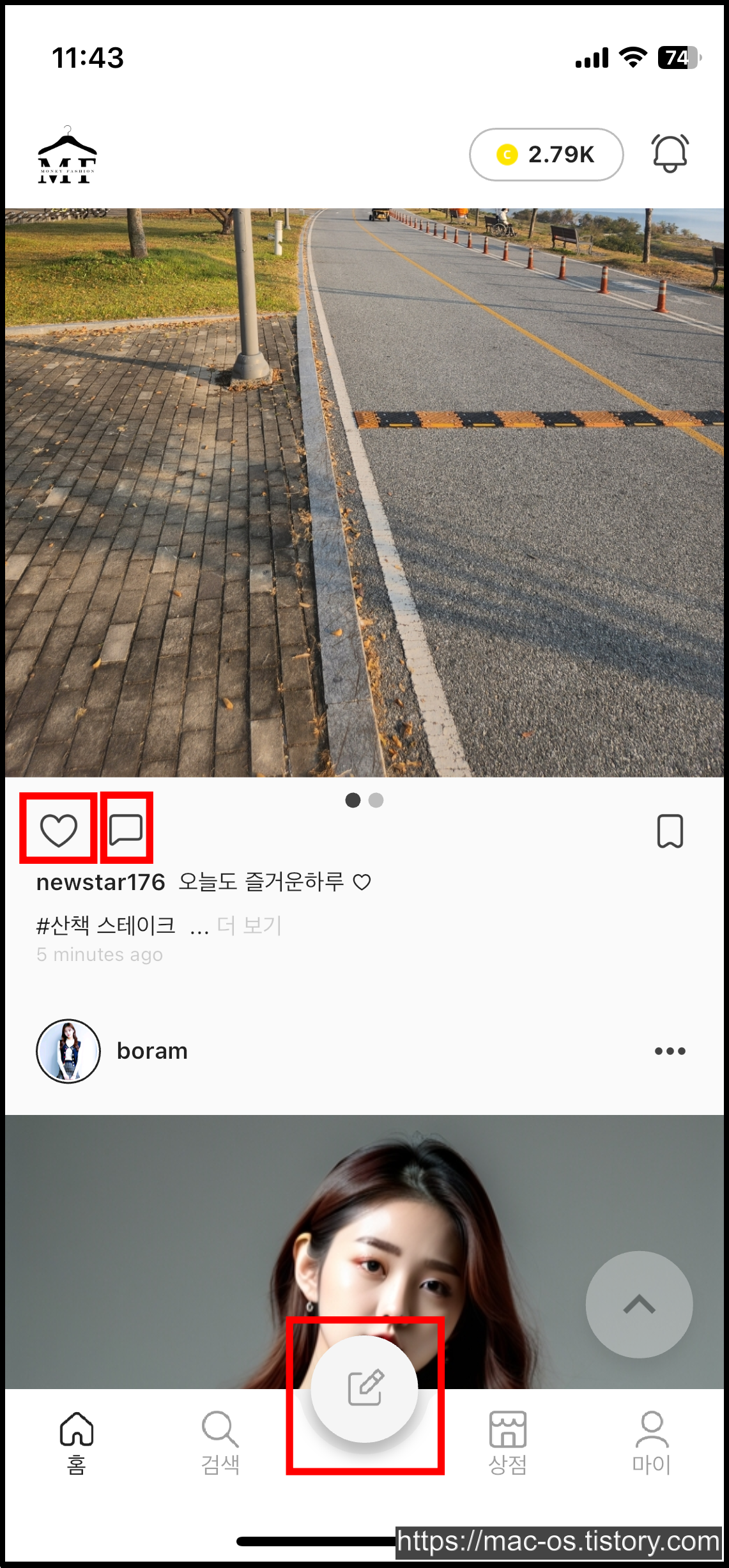 일일미션 참여 방법에 대해 살펴보겠습니다. 홈에서 다른 사람의 게시글이 나오는데 하트 5개, 댓글 1개, 글쓰기 1회를 하면 총 100캐시가 적립됩니다.