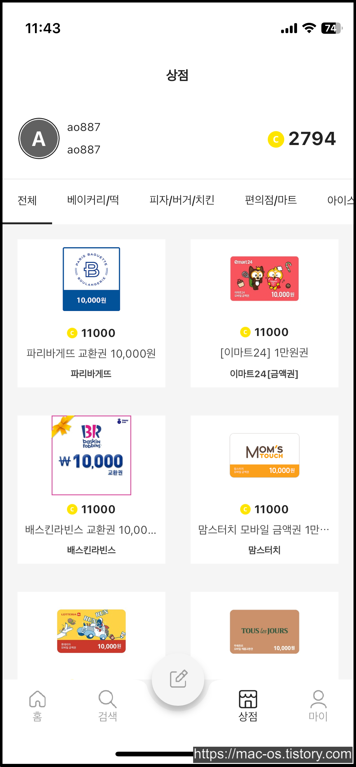 이렇게 얻은 머니패션 캐시는 상점에서 파리바게트 교환권, 이마트24 상품권, 베스킨라빈스 교환권, 맘스터치 모바일 금액권 등 주로 가맹점의 상품권으로 교환이 가능한데요. 다만 아직 출시되지 얼마 안되서 그런지 상품은 별로 없습니다.