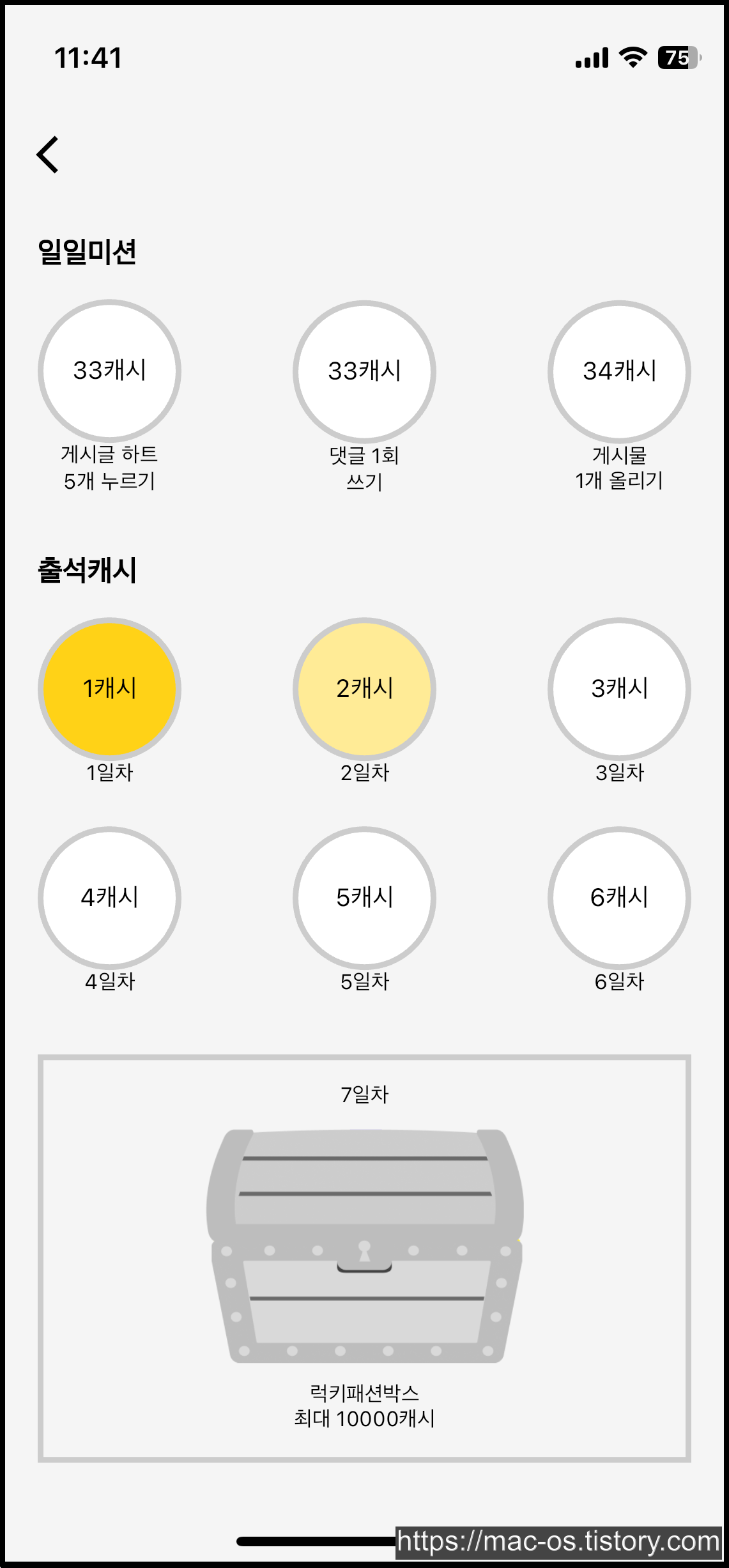 게시글 하트 5개 누르기, 댓글 1회 작성하기, 게시글 1개 올리기를 통해 하루 100캐시를 얻을 수 있고 출석을 하면 출석일수에 따라 소량의 캐시가 지급됩니다. 다만 출석 7일차에는 최대 1만캐시가 등장하는 럭키패션박스를 개봉할 수 있습니다.