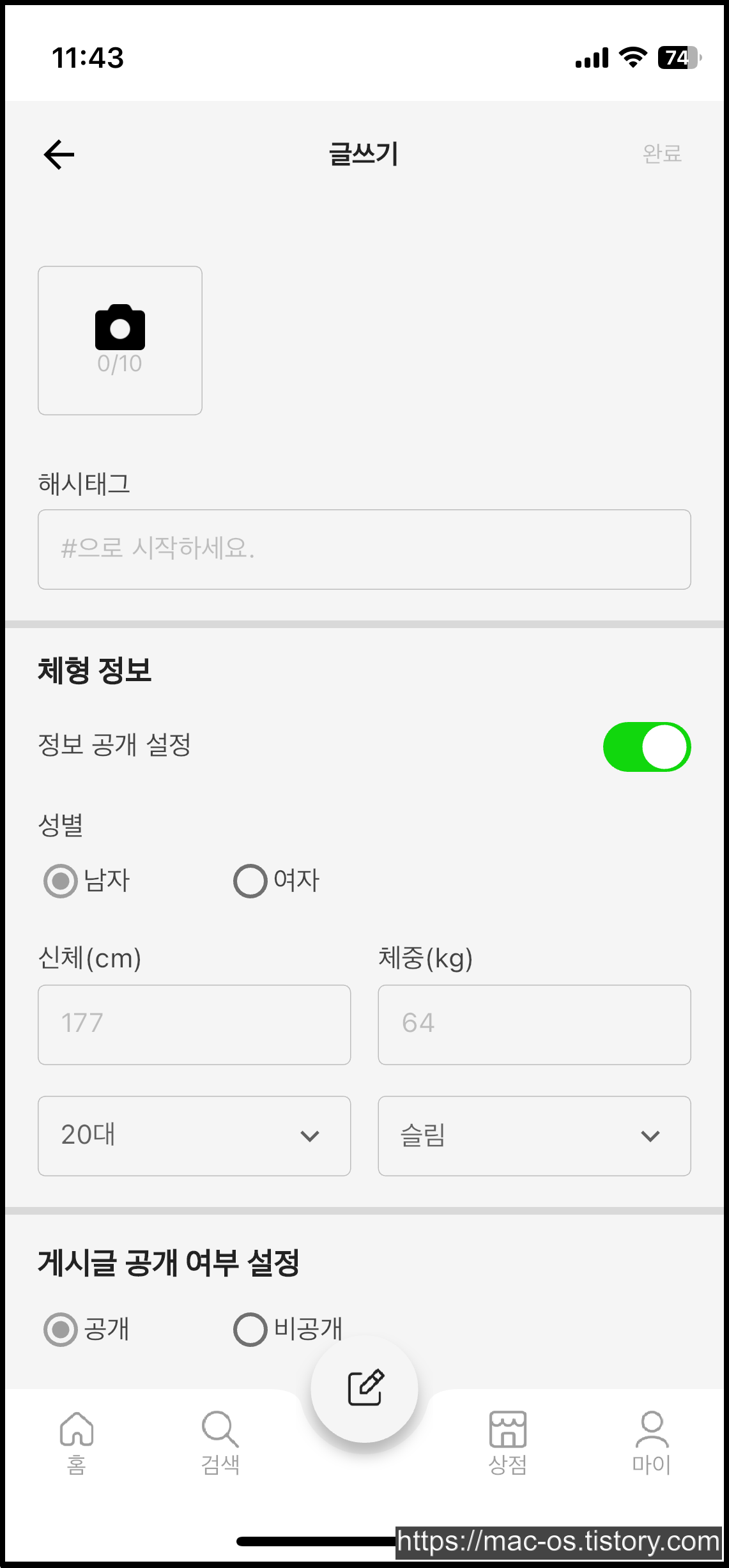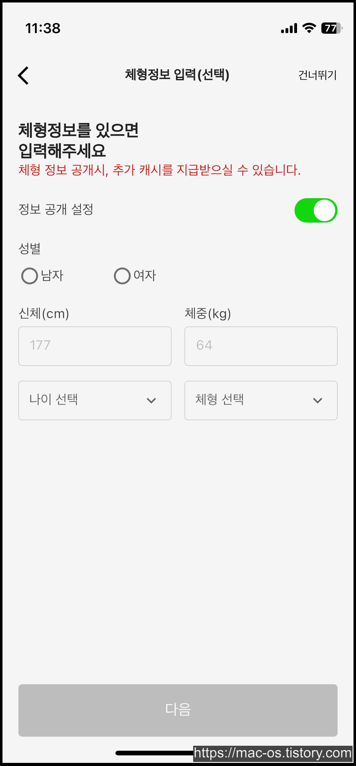 체험정보(성별, 키, 체중, 나이, 체형)을 입력하면 500포인트가 적립되니 입력하는게 좋습니다.