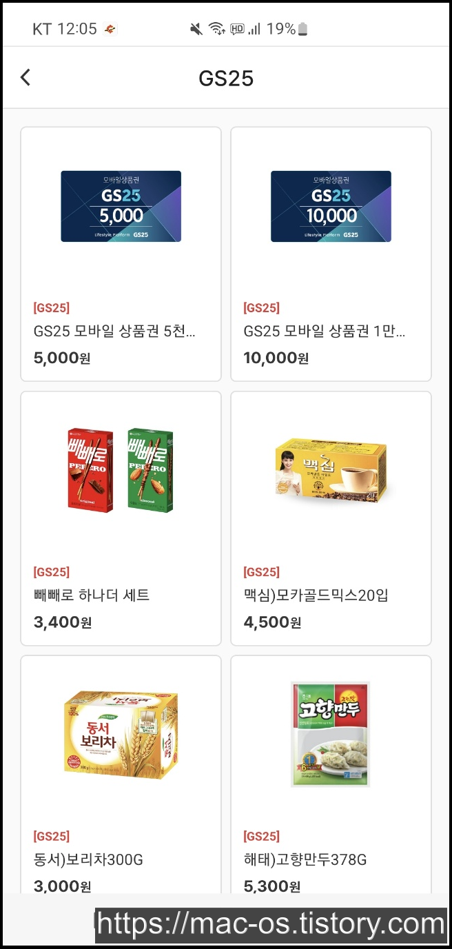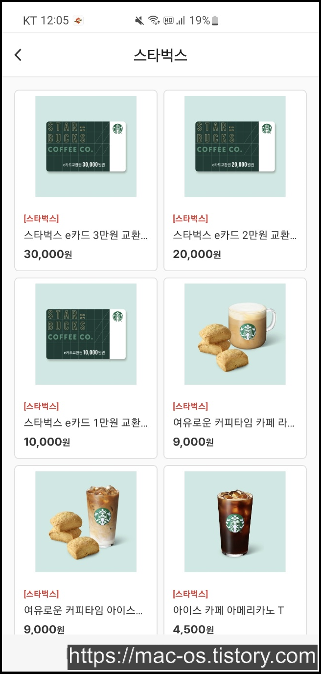 스토어에서 상품권하고 기프티콘을 구매할 수 있는데요. 비율은 1대1이고 편의점, 스타벅스 브랜드가 많네요.