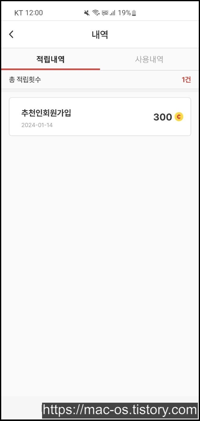 회원가입에 성공한 모습입니다. 적립내역을 보면 추천인회원가입으로 300원이 적립된 것을 볼 수 있고요.