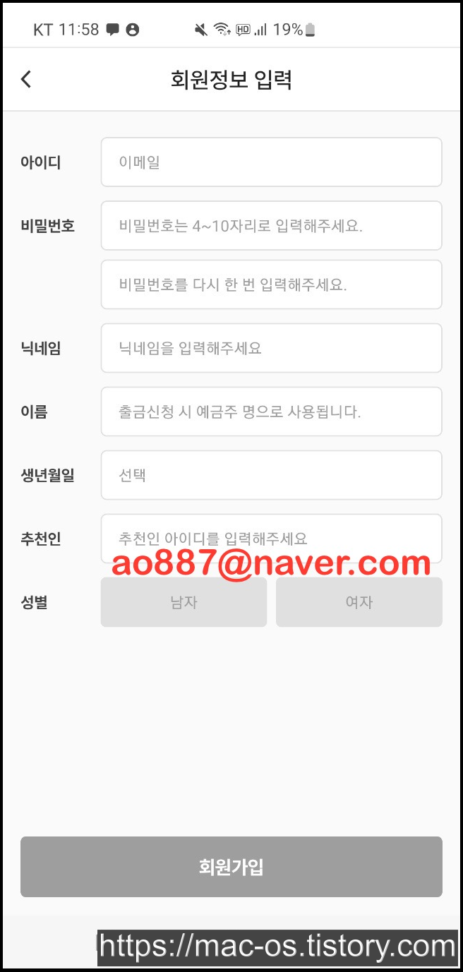 휴대폰 문자인증을 하고 나면 회원정보 입력 페이지가 나오는데 여기서 추천인을 입력할 수 있습니다. 추천인을 입력하면 300원이 지급되니 잊지마세요.