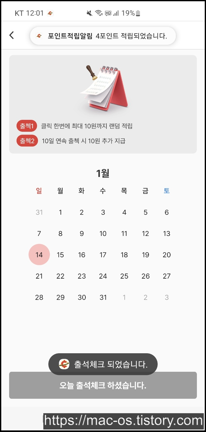 출석체크를 하면 최대 10원까지 주는데 저는 4원이 나왔습니다. 출석체크를 하면 배너 광고가 뜨는 경우가 종종 있는데 이 앱은 그런게 없어서 좋네요.