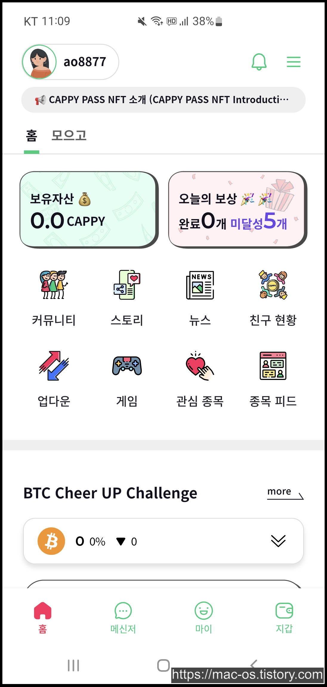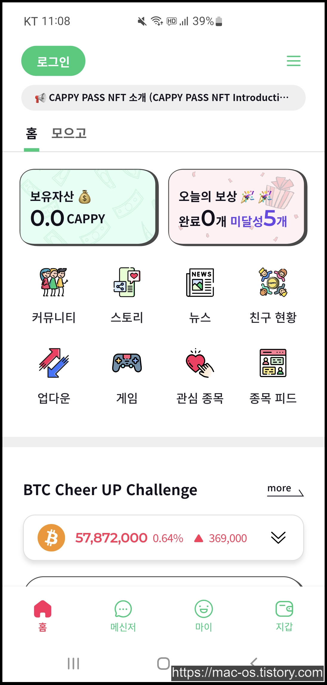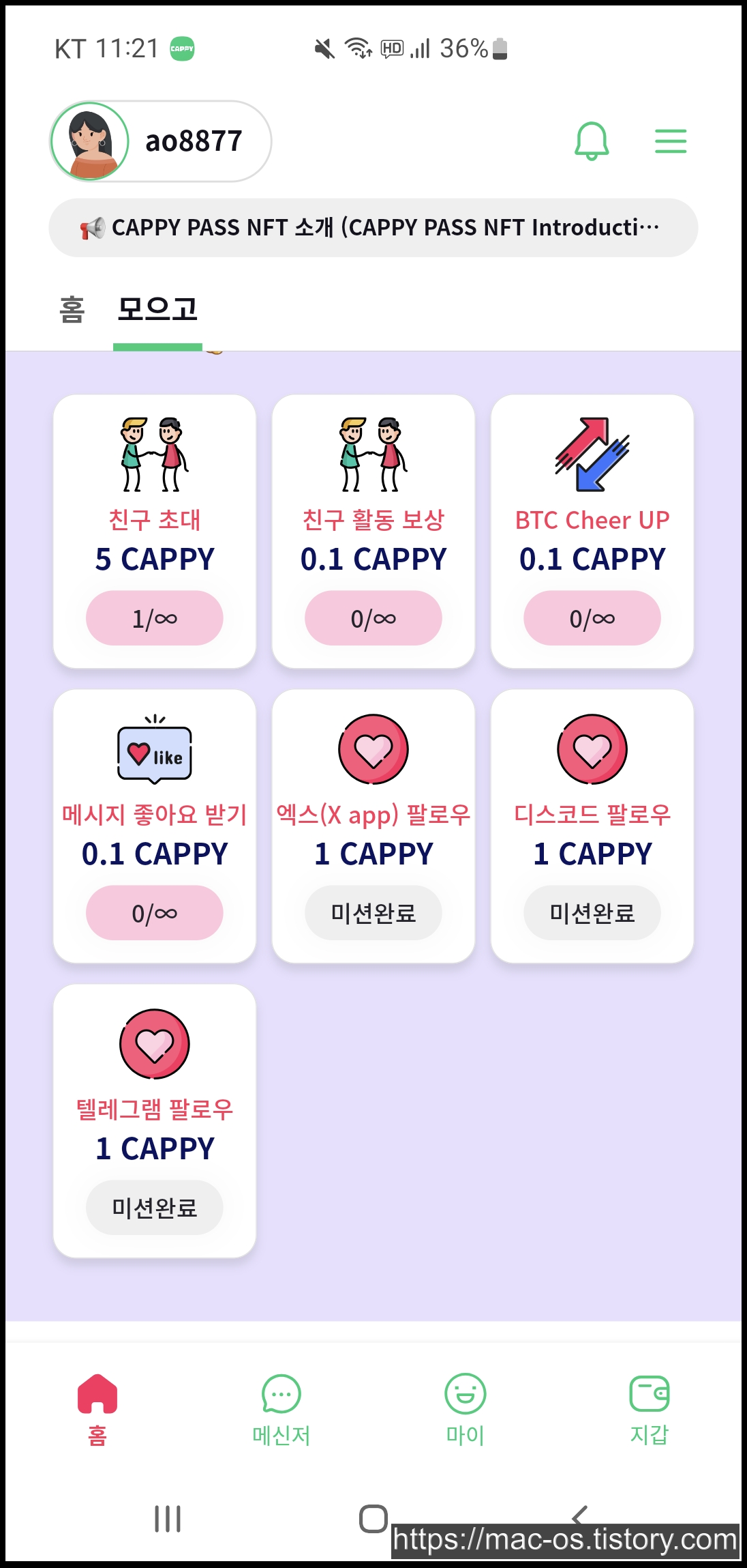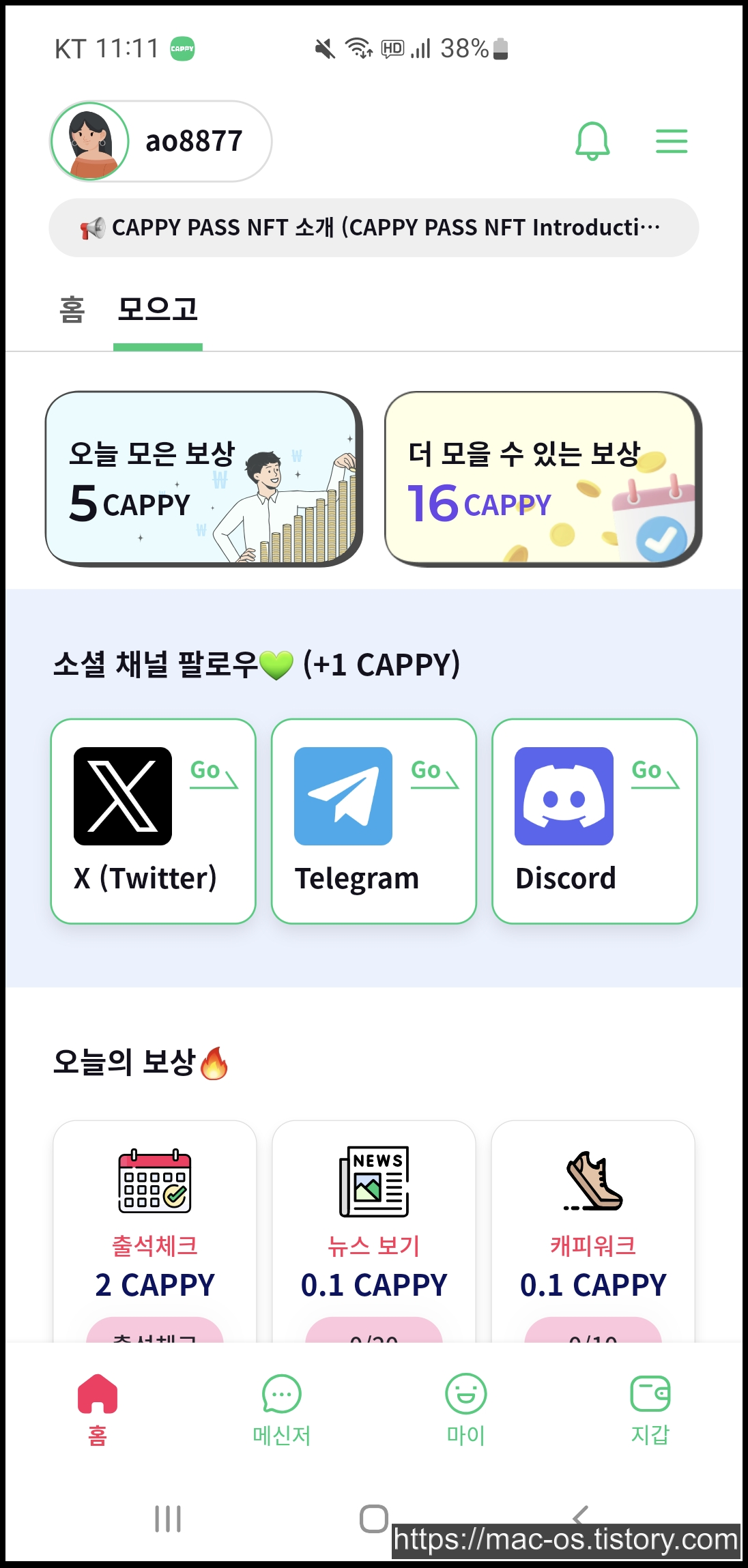 캐피 앱에서 CAPPY라는 가상화폐를 얻는 방법에 대해 살펴보겠습니다. 우선 모으고 탭으로 들어오면 소셜 채널을 팔로우하면 채널마다 1캐피를 받을 수 있습니다.