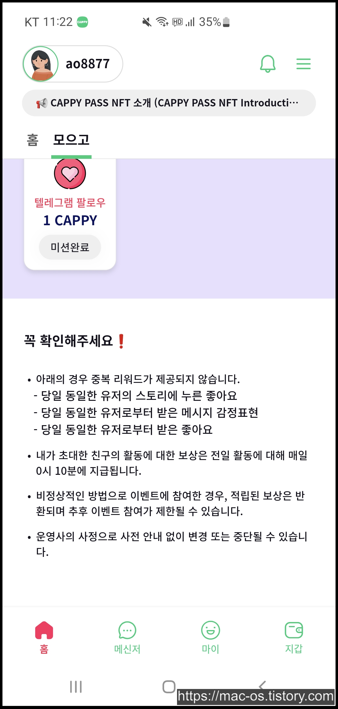 메신저 기능을 사용해봤는데 딜레이가 굉장히 심해서 사용하기 불편했습니다. 위에서 소개드린 모으고는 당일 동일한 유저의 스토리에 누른 좋아요, 받은 메시지 감정표현, 받은 좋아요는 중복 리워드가 제공되지 않다고 하네요.