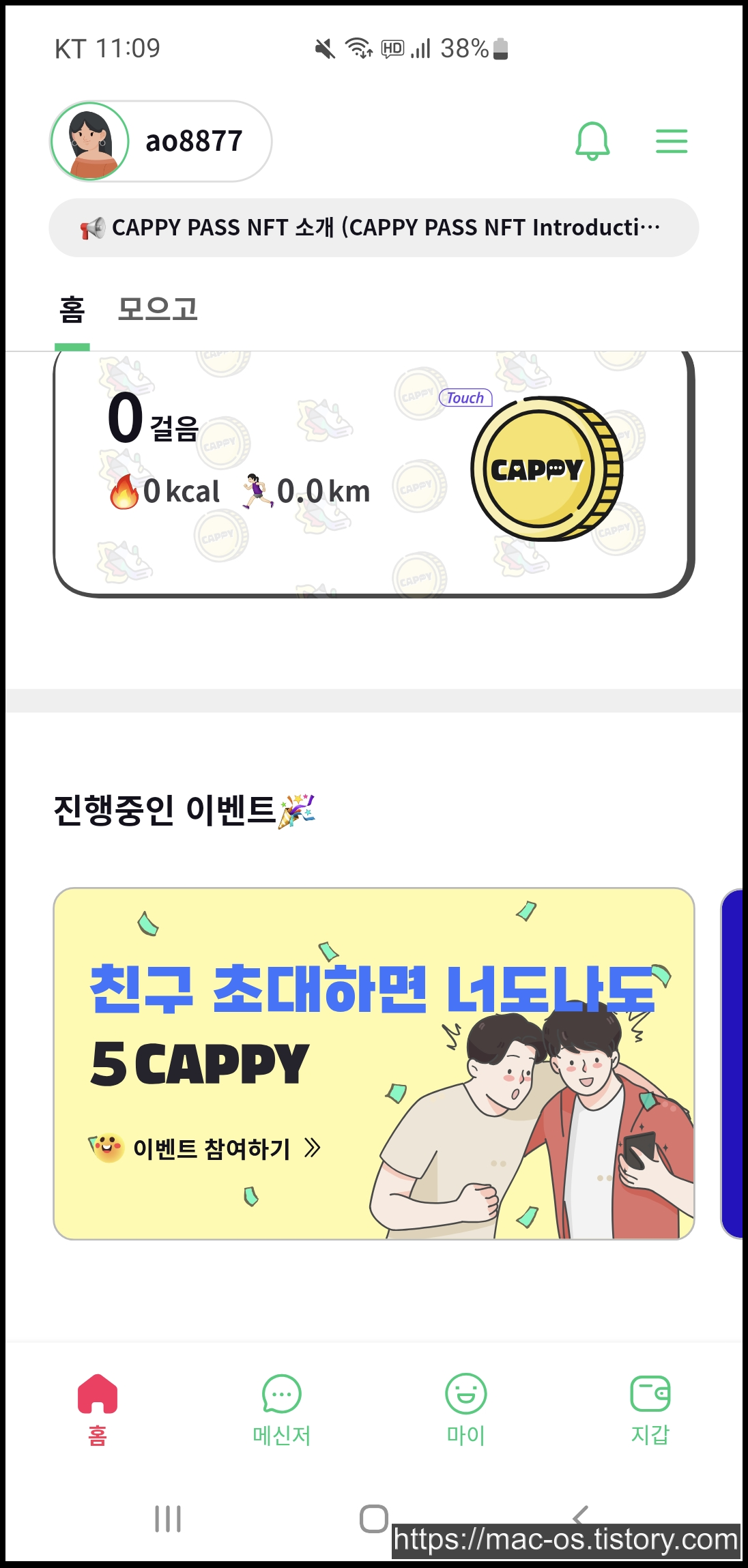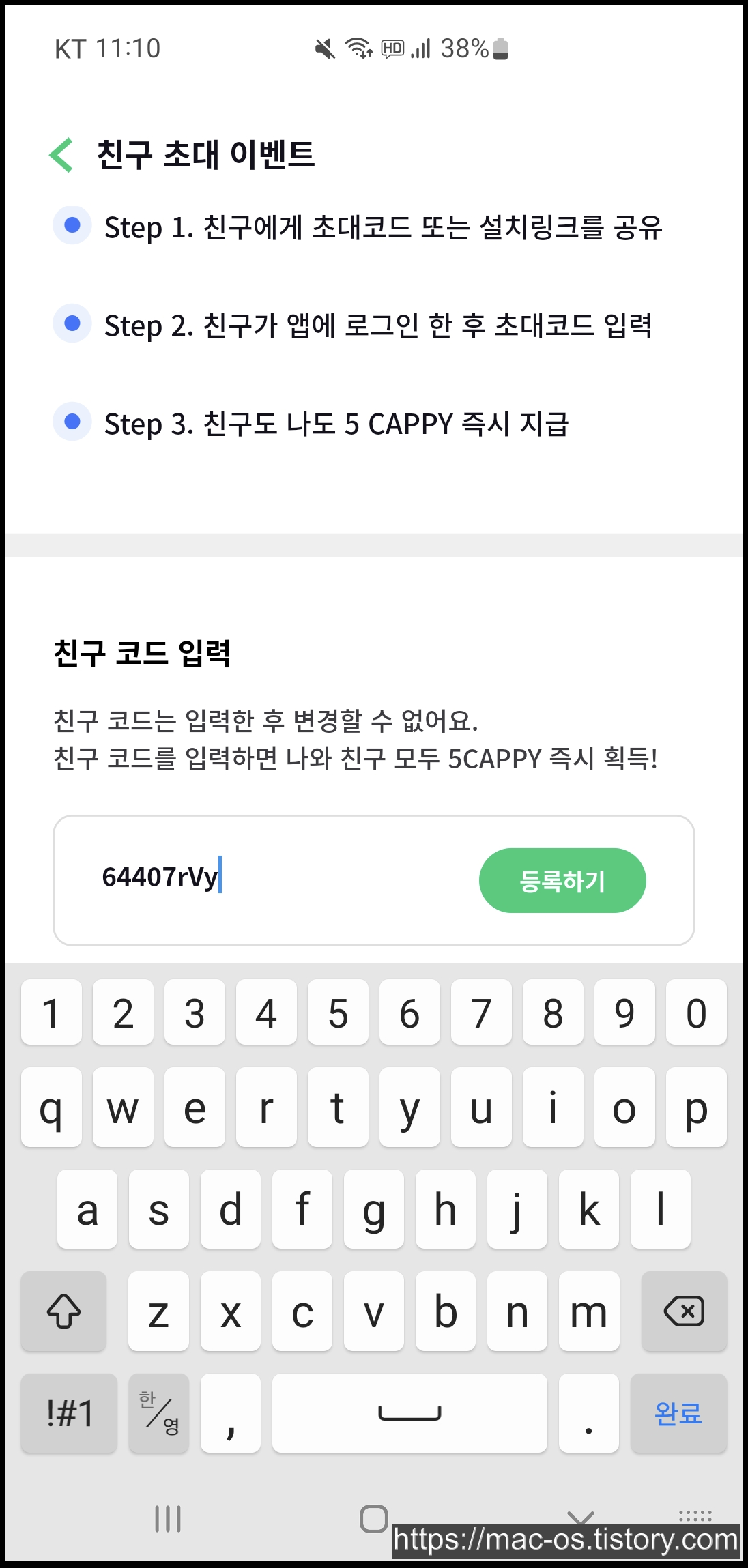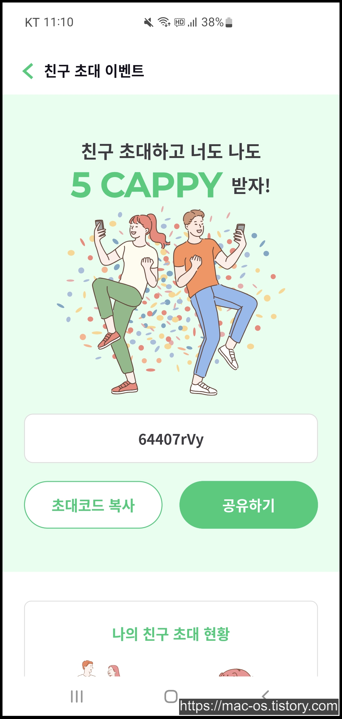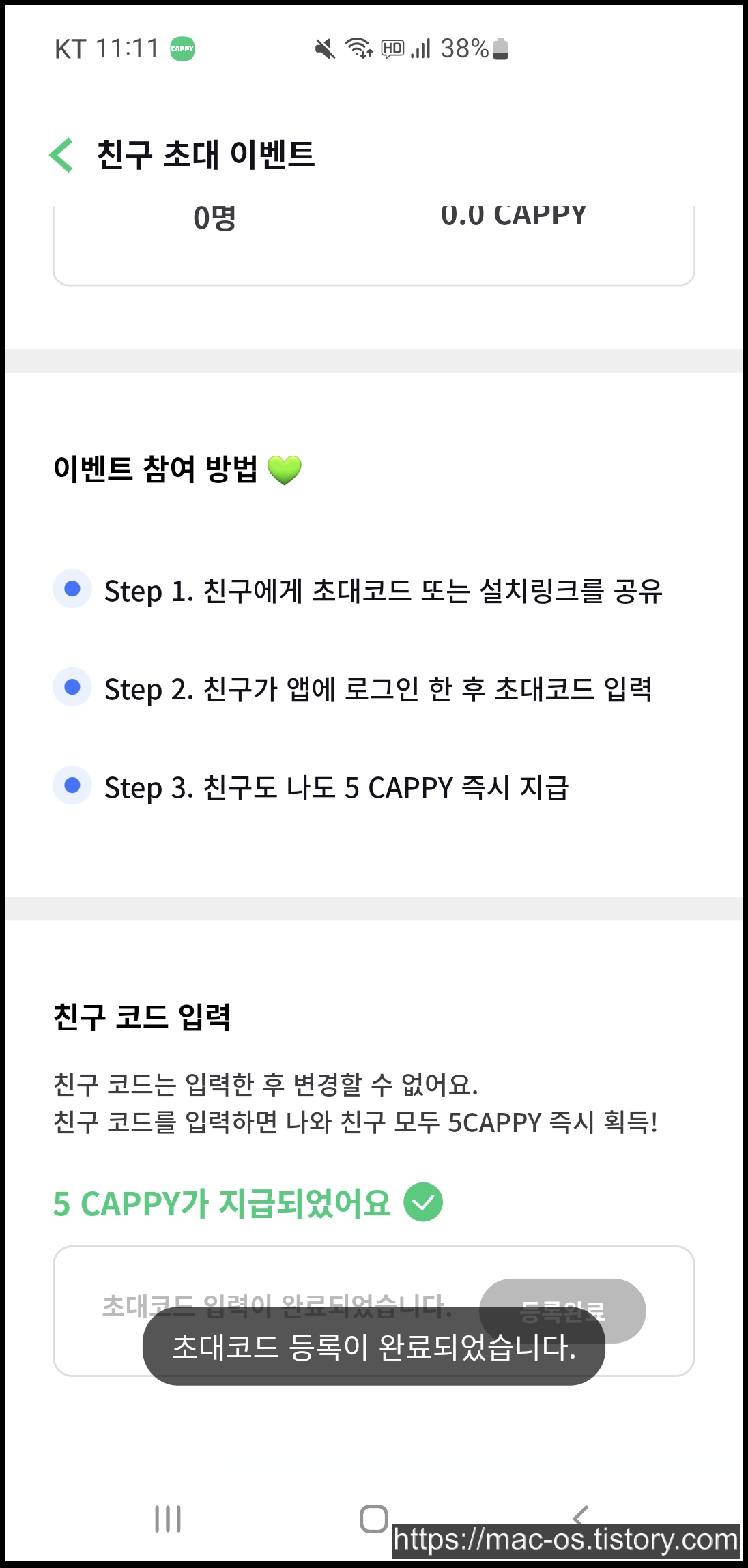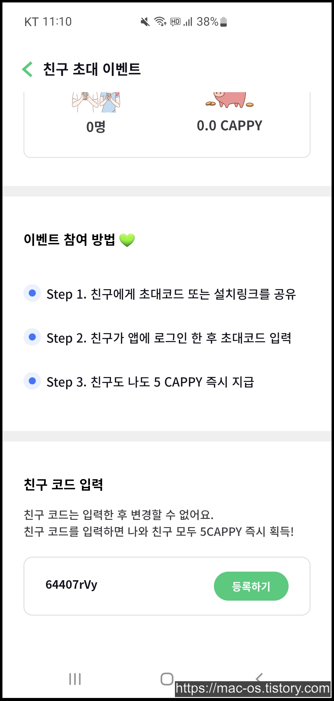 회원가입 후 홈 화면에서 아래로 스크롤을 내리면 친구초대 이벤트 배너가 있는데요. 이벤트 페이지 하단에서 친구코드 64407rVy를 입력하면 신규회원은 5CAPPY를 즉시 획득할 수 있습니다.