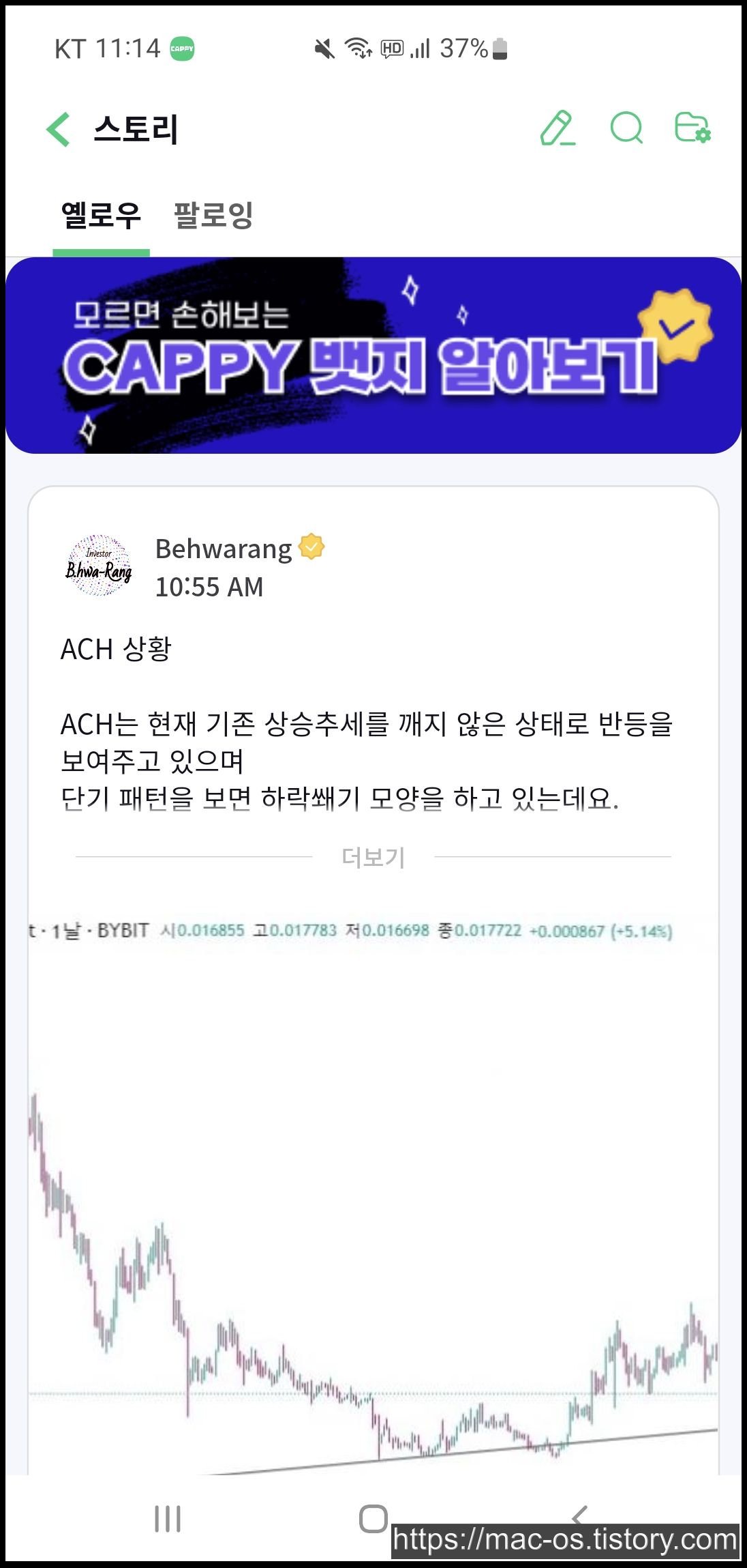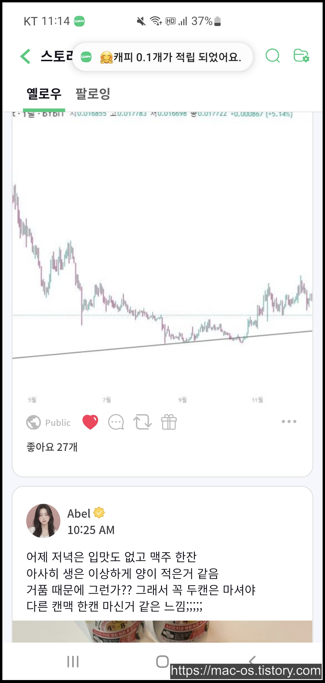 스토리에 들어오시면 여러 사람들이 올린 게시글이 있는데요. 게시글에 좋아요를 누르면 한번에 0.1캐피, 하루 최대 10번 1캐피가 적립되고 게시글을 올려서 내 글이 다른 사람에게 좋아요를 받으면 한번에 0.1캐피, 하루 최대 100번 10캐피가 적립됩니다.