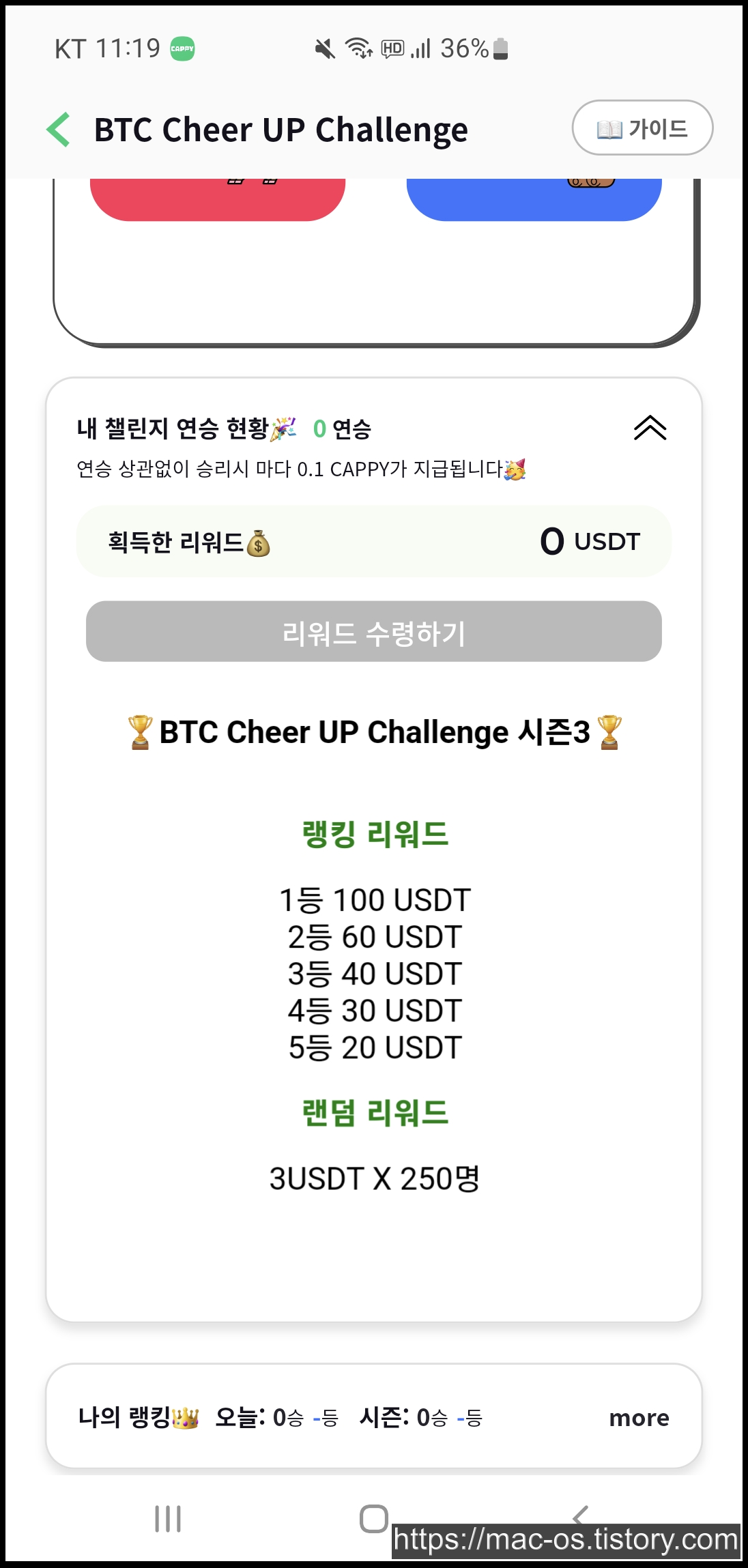 챌린지에서 가격을 맞춘 횟수에 따라 등수가 정해지고 랭킹 1등에 당첨되면 100USDT를 받게 됩니다. USDT는 1달러와 동일한 가치를 지니며 한국 돈으로 계산하면 환율을 고려하여 약 13만3천원 정도가 되겠습니다.