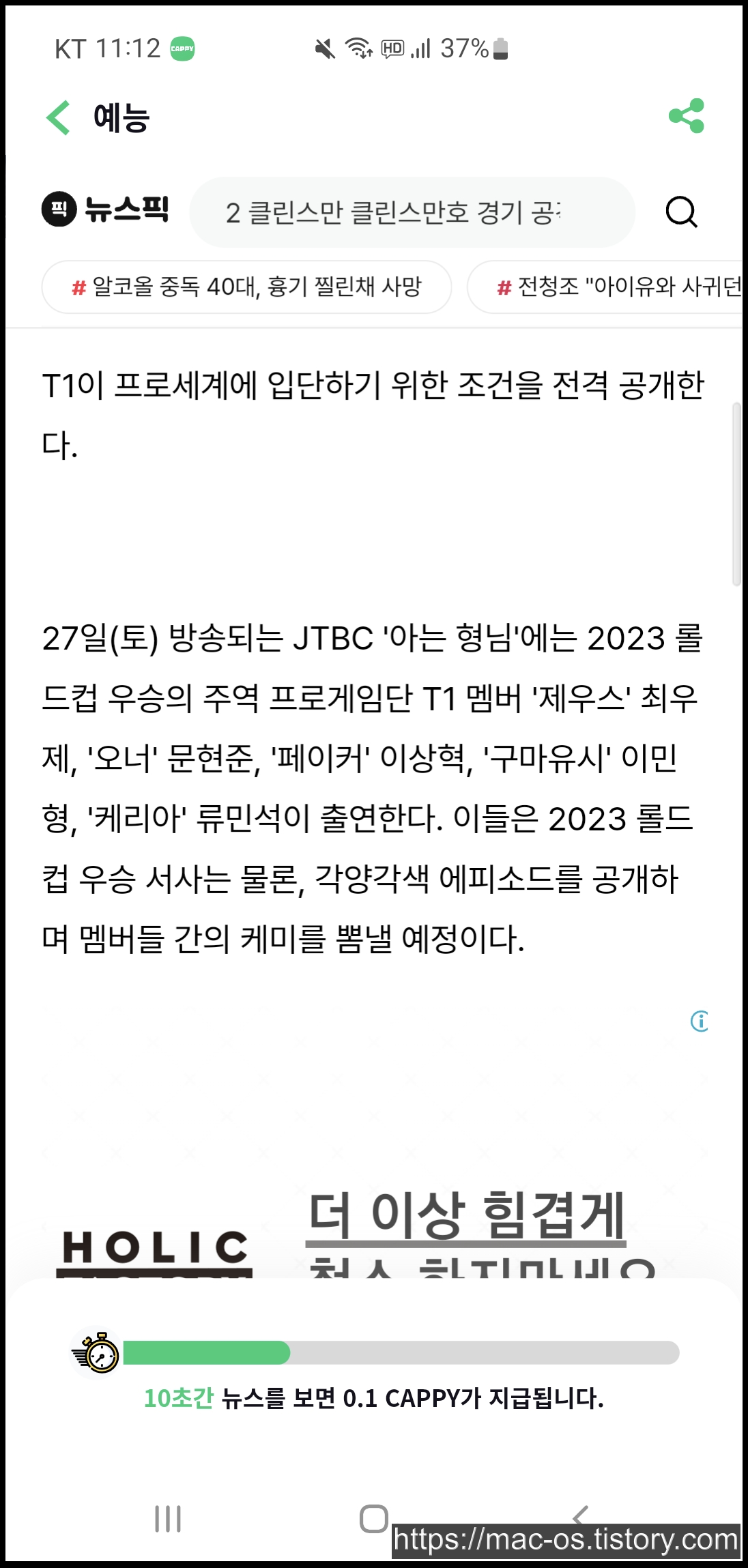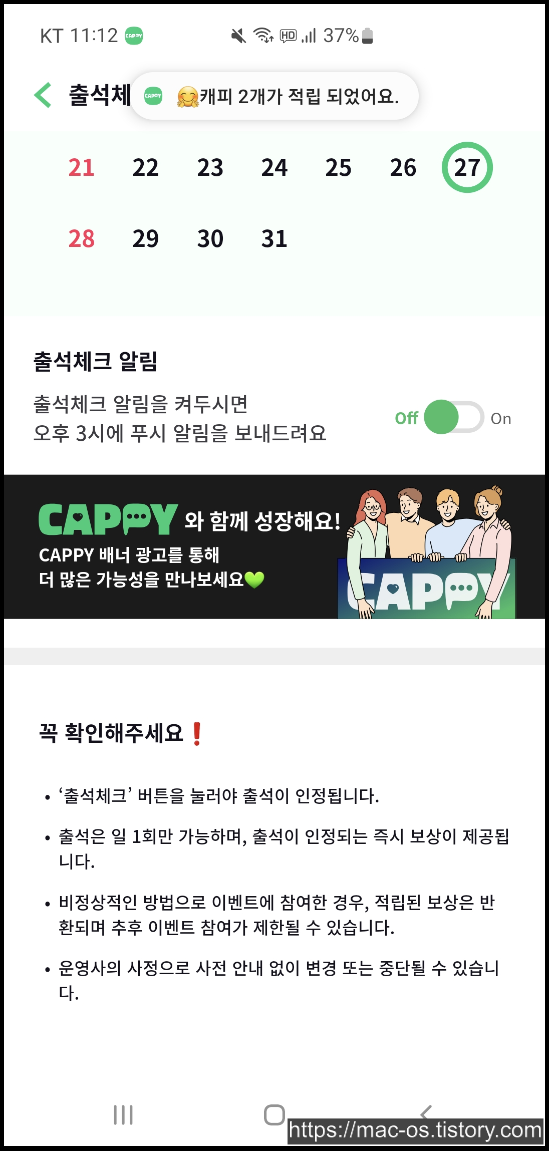 뉴스보기는 뉴스픽에서 10초정도 뉴스를 보면 뉴스 하나당 0.1캐피를 주는데요. 하루에 20번, 총 2캐피까지 얻을 수 있고 3번째 사진은 캐피워크입니다. 캐피워크는 해보지 않아서 추측이지만 1천 걸음당 0.1캐피, 1만 걸음에 1캐피인 것으로 보입니다.