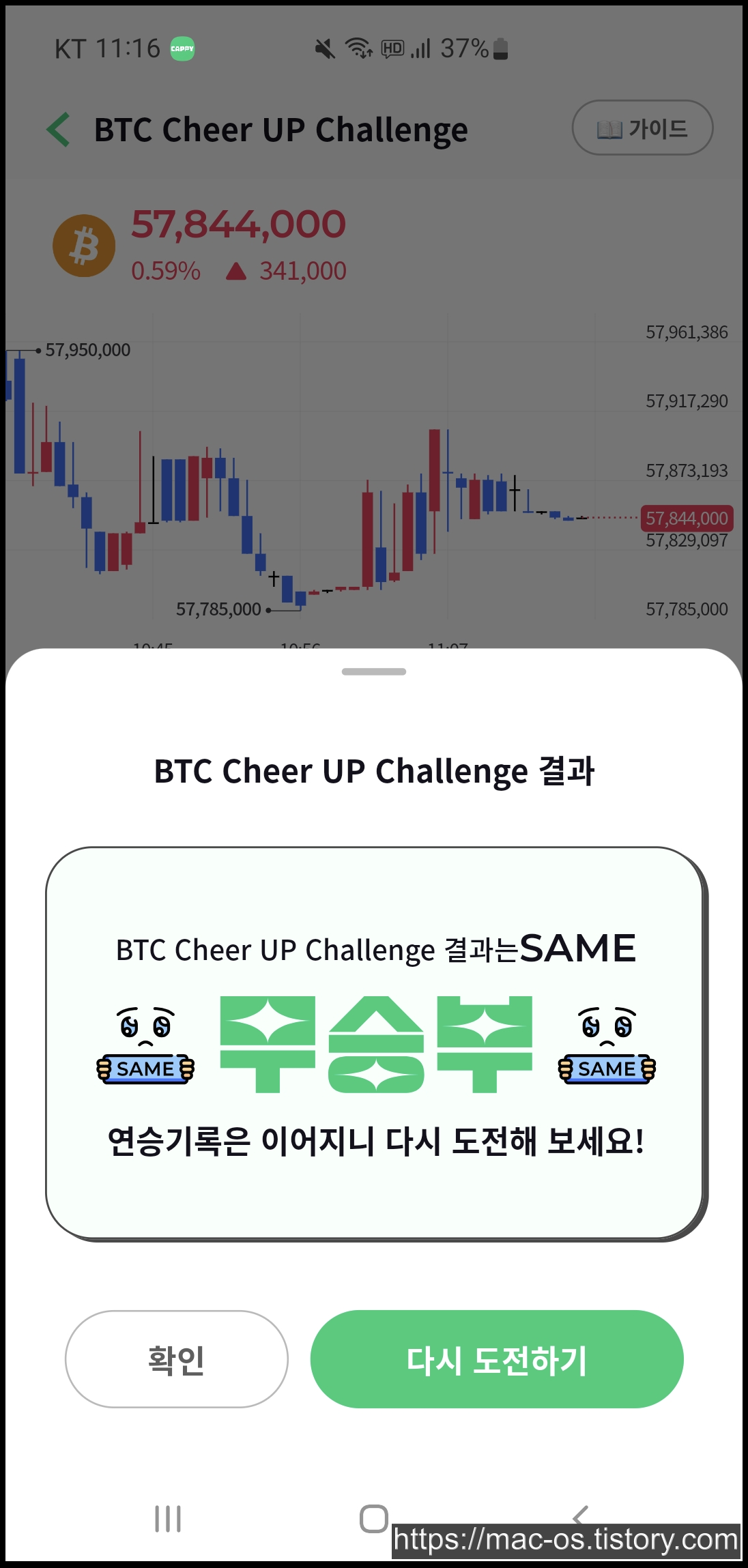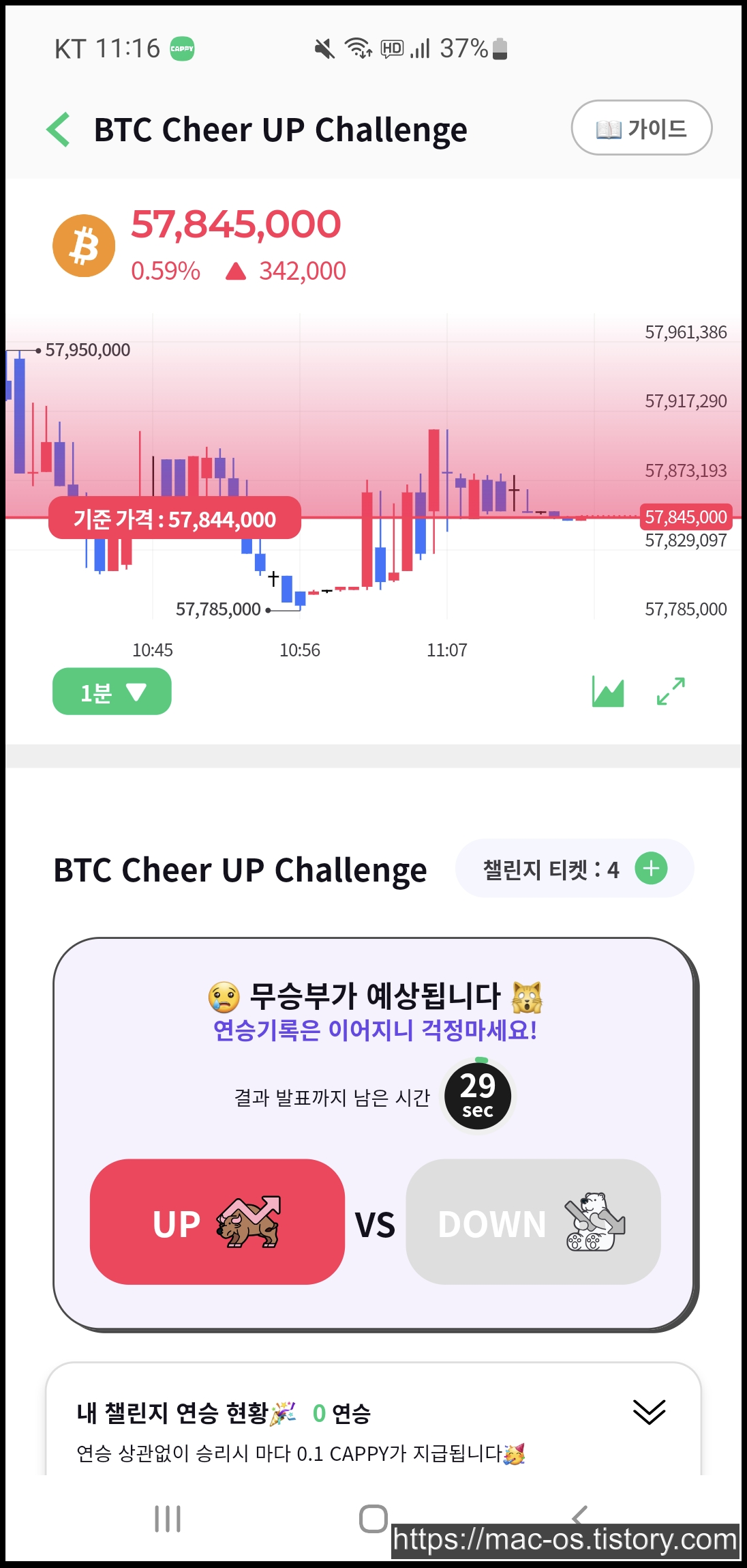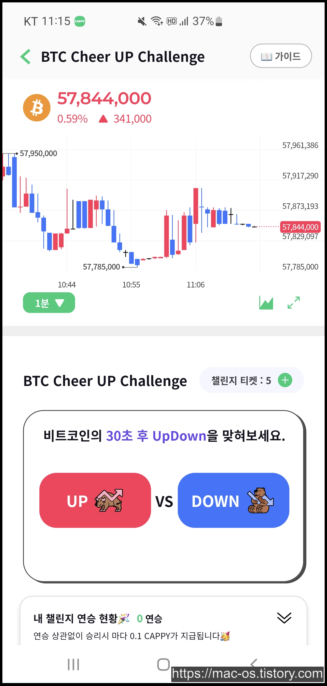 비트코인 치얼업 챌린지는 비트코인의 30초 후 가격이 상승할지, 하락할지 예측하는 게임입니다. 챌린지에 응답하려면 챌린지 티켓이 필요하고 매일 3개의 챌린지 티켓이 무료로 제공됩니다. 추가로 티켓을 얻고 싶다면 캐피를 지불하고 티켓을 구매하는 것도 가능합니다.