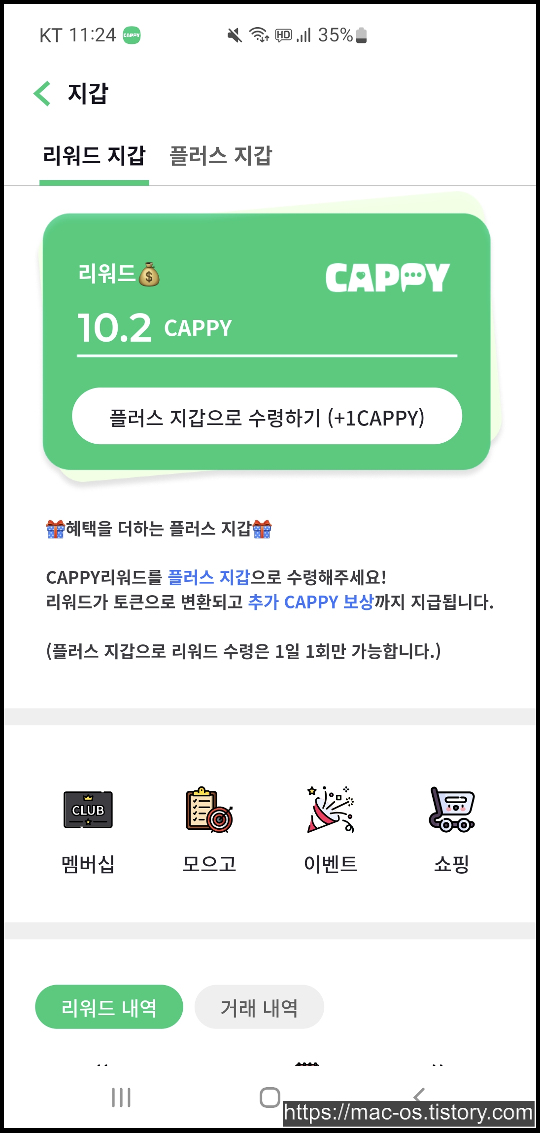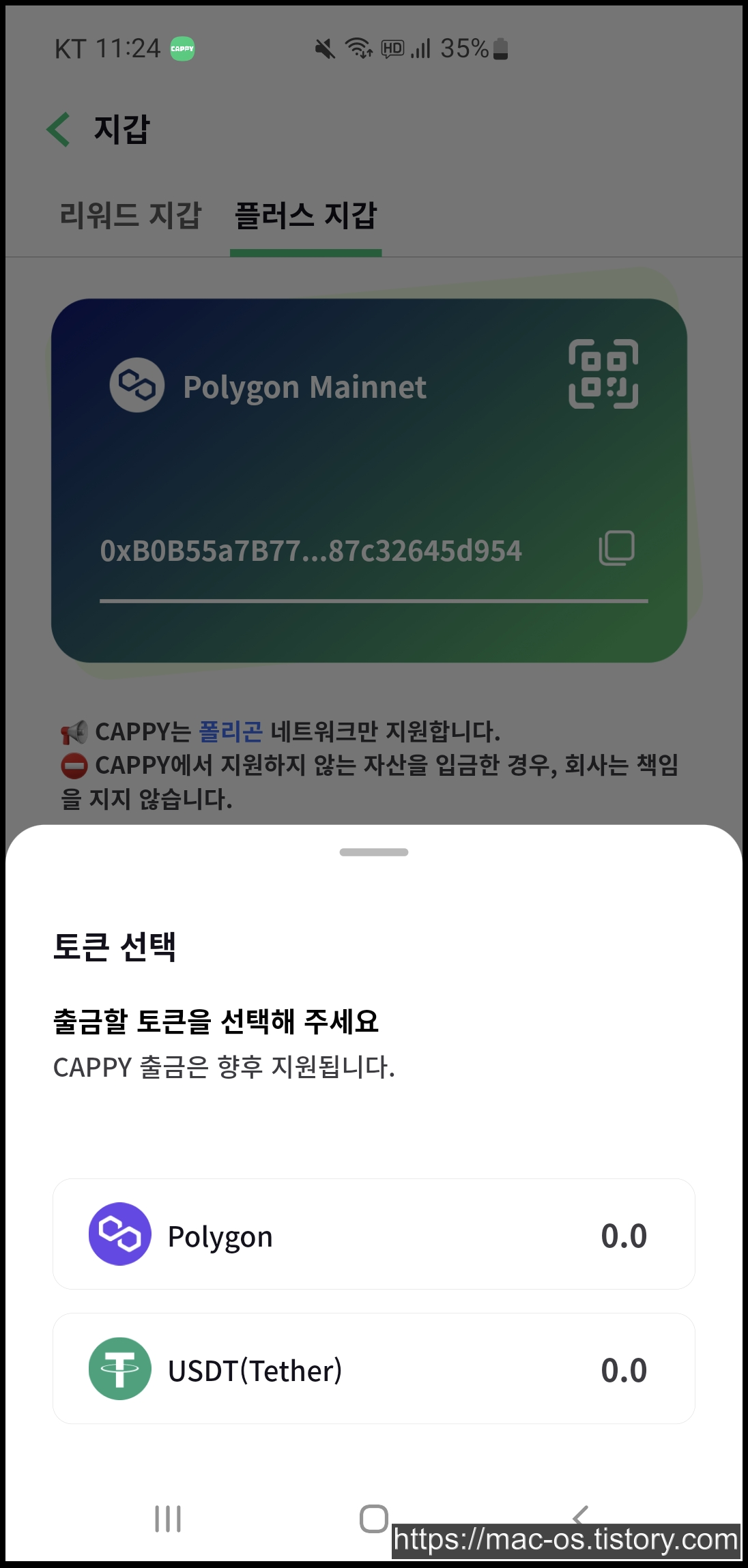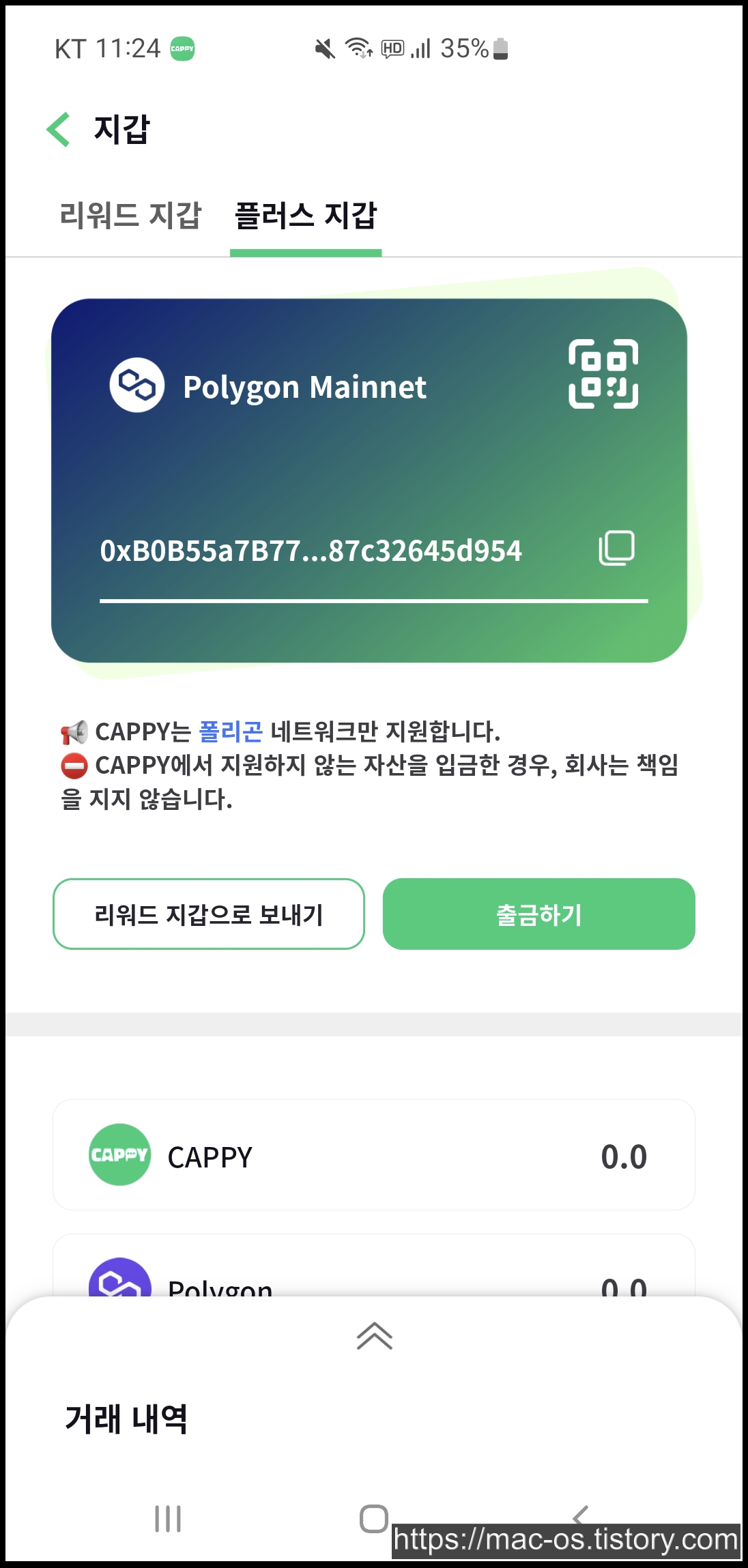 캐피에서 얻은 CAPPY 가상화폐는 리워드 지갑에서 플러스 지갑으로 수령하여 폴리곤이나 테더로 출금할 수 있습니다. 다만 10캐피를 플러스 지갑으로 수령하려고 해봤는데 아직 업데이트중이라고 안된다고 나와서 조금 시간이 필요한 것 같습니다.