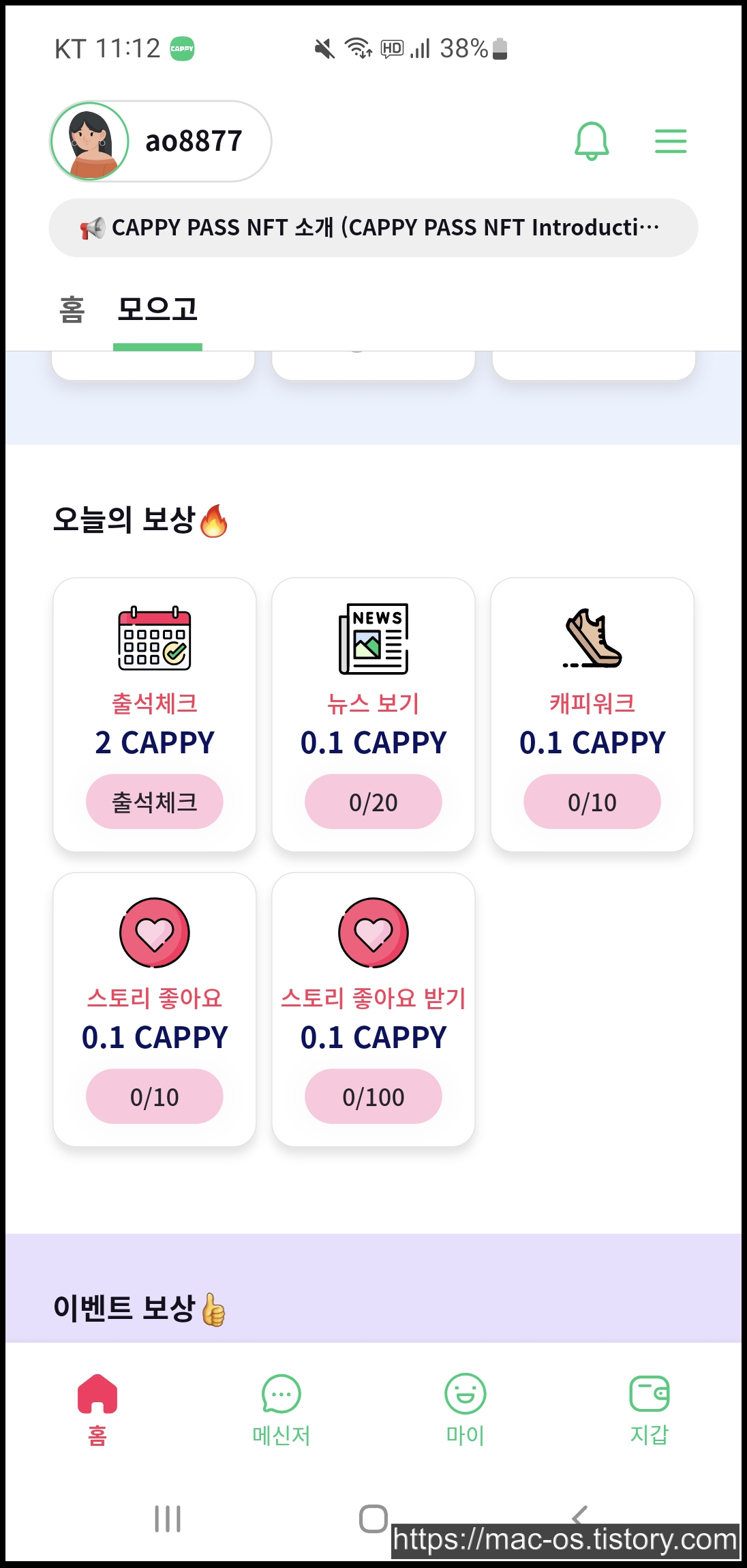 우선 캐피는 게시글을 작성하여 다른 사람에게 좋아요를 받거나 1:1 대화에서 메시지 좋아요 받기 또는 출석체크, 캐피워크, 뉴스보기 등을 통해 CAPPY라는 가상화폐를 받을 수 있습니다.