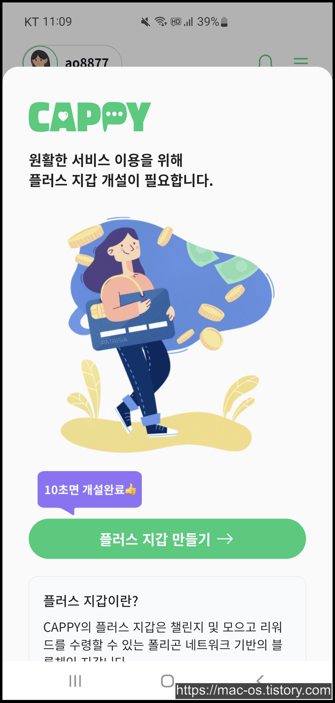 로그인을 하게 되면 플러스 지갑을 만들라는 창이 나오는데요. 플러스 지갑 만들기 버튼을 터치합니다.