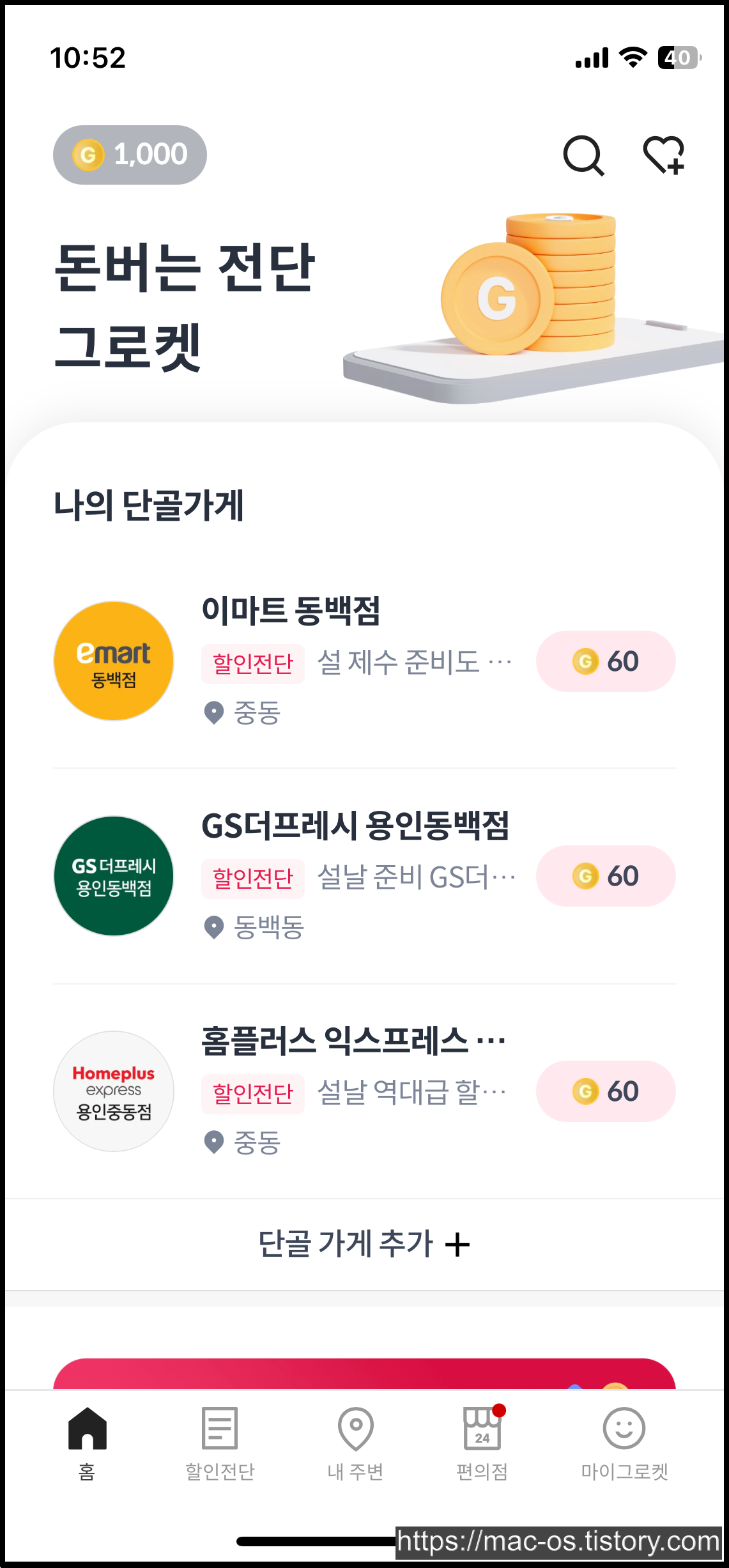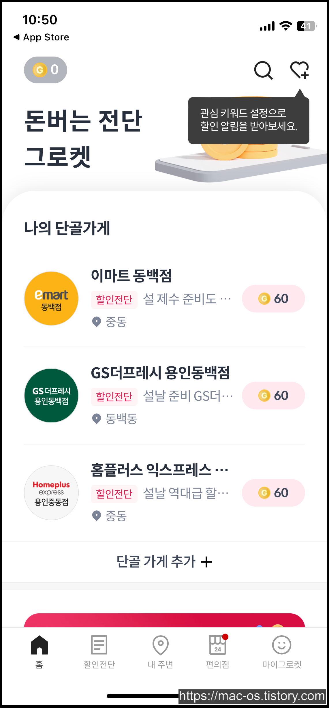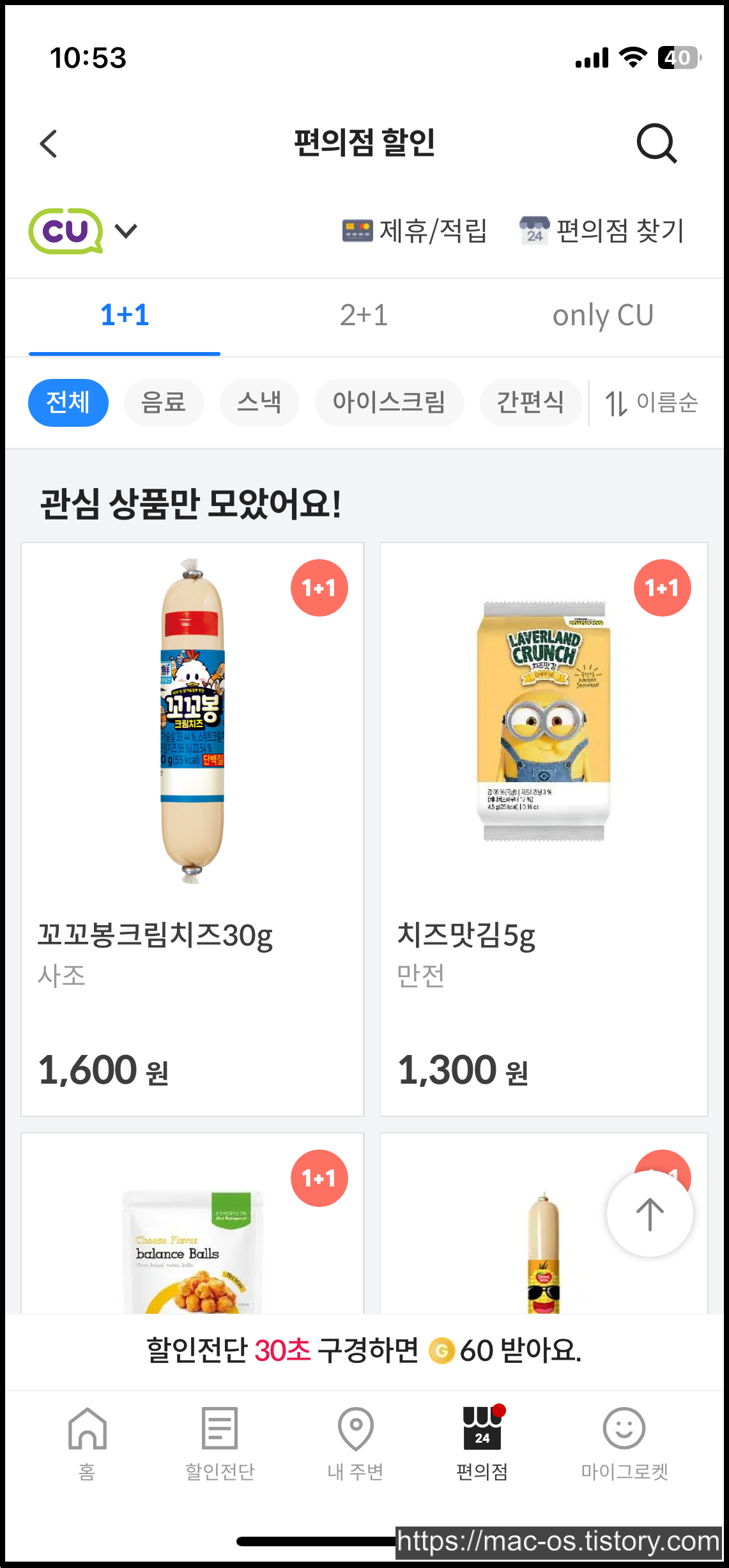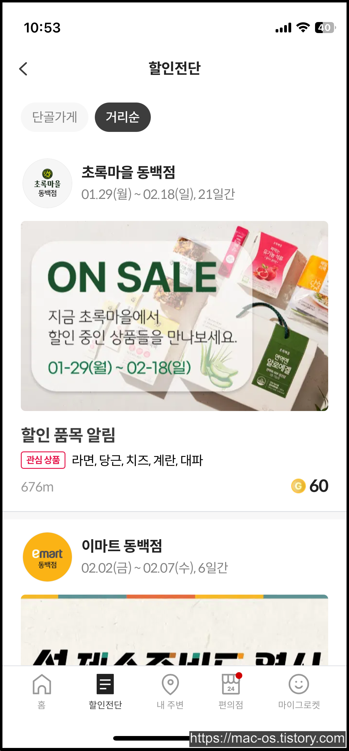 편의점 탭도 있는데 여기서 1+1, 2+1 행사중인 상품을 한눈에 확인할 수 있다. 할인전단 탭에선 단골가게와 거리순 할인전단을 볼 수 있는데 거리순으로 누르면 단골가게로 설정하지 않은 가게도 나와서 포인트 적립이 가능하다.