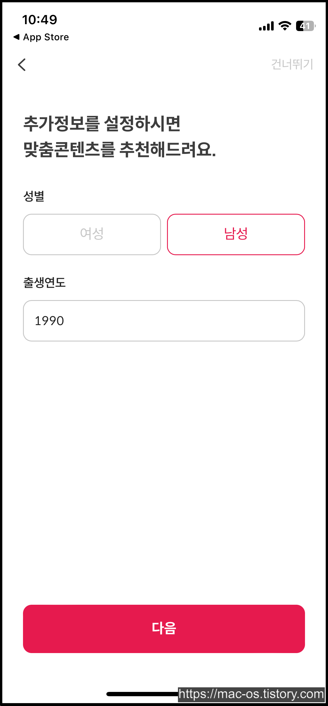 성별, 출생연도와 같은 추가정보를 설정하면 맞춤컨텐츠를 추천받을 수 있다. 맞춤 전단지를 원하는 경우 기호에 맞게 선택한다.