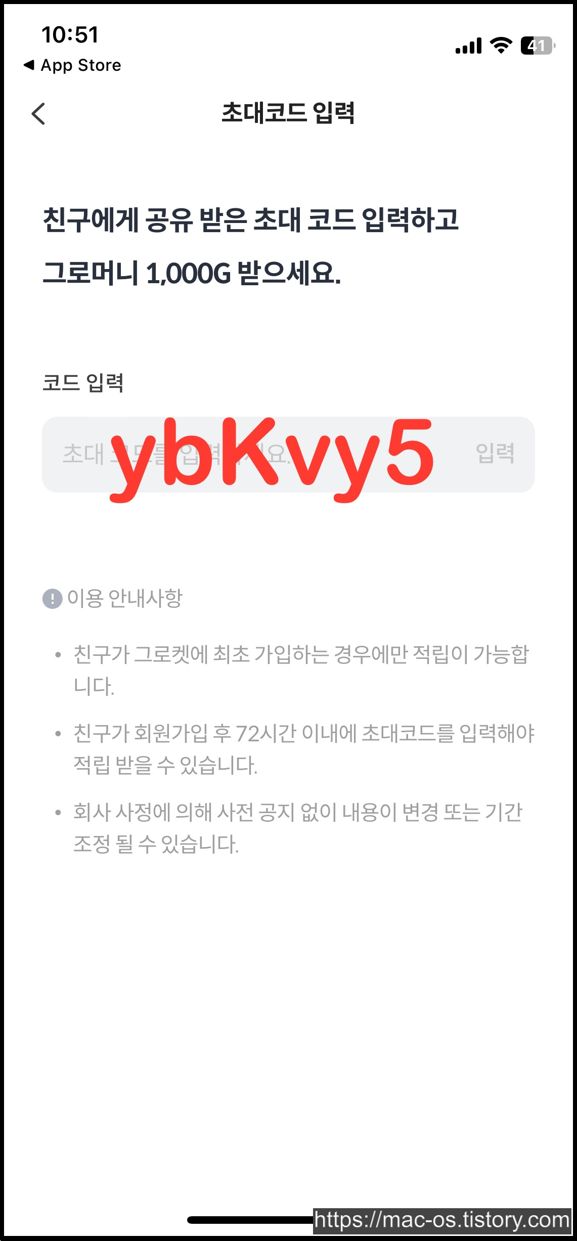 여기서 그로켓 초대코드 ybKvy5를 입력하면 1000포인트를 적립받을 수 있다. 복사를 하고 싶은 사람은 댓글창에 있는 코드를 꾹 눌러서 복사하면 된다.