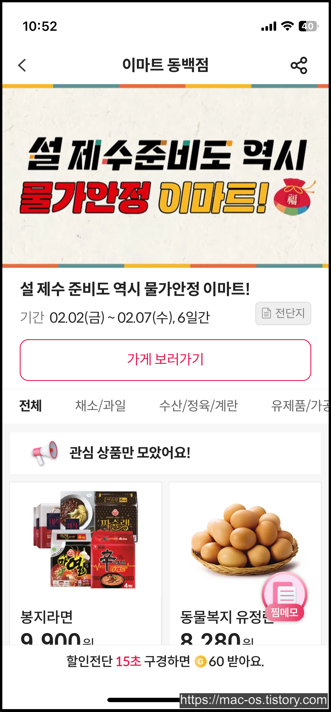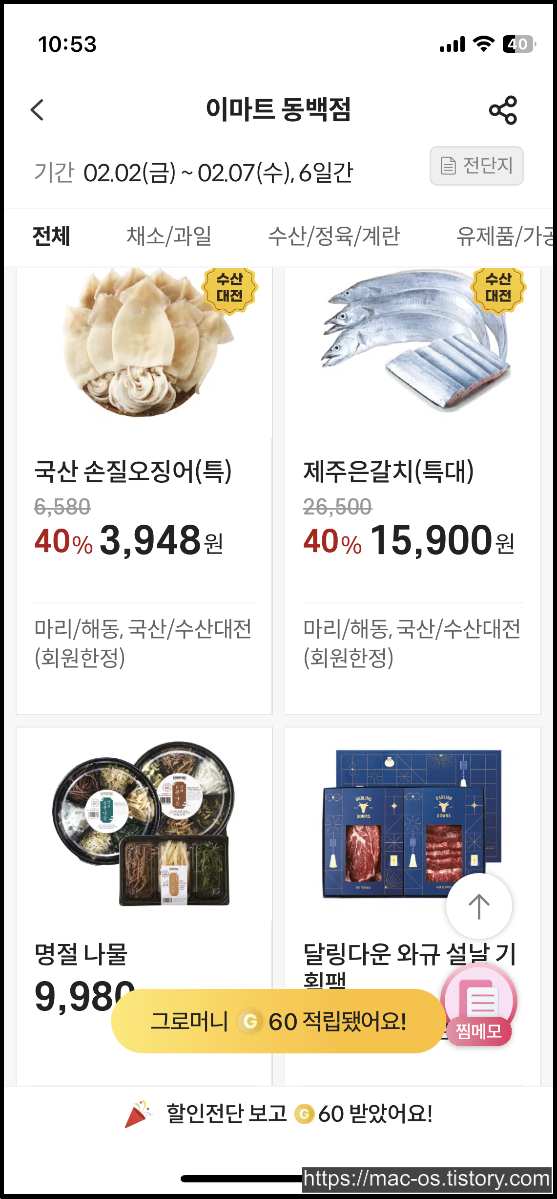 그로켓에서 포인트를 적립하는 방법은 간단하다. 단골가게를 설정하여 단골가게를 만든 뒤 단골가게를 터치하면 할인 전단지를 확인할 수 있다. 할인전단 페이지에서 스크롤을 내려 15초간 구경하면 60포인트가 적립된다.