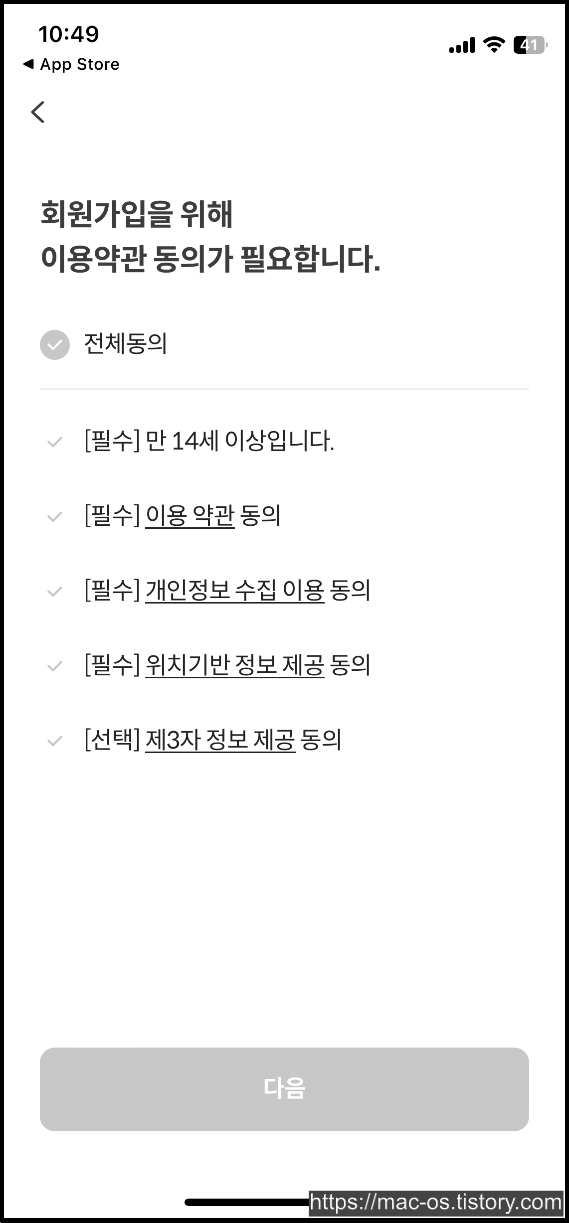 휴대폰 번호로 시작한 경우 휴대폰 번호를 입력하고 문자로 온 인증번호를 입력한다. 그리고 이용약관에 동의하고 다음 버튼을 누른다.