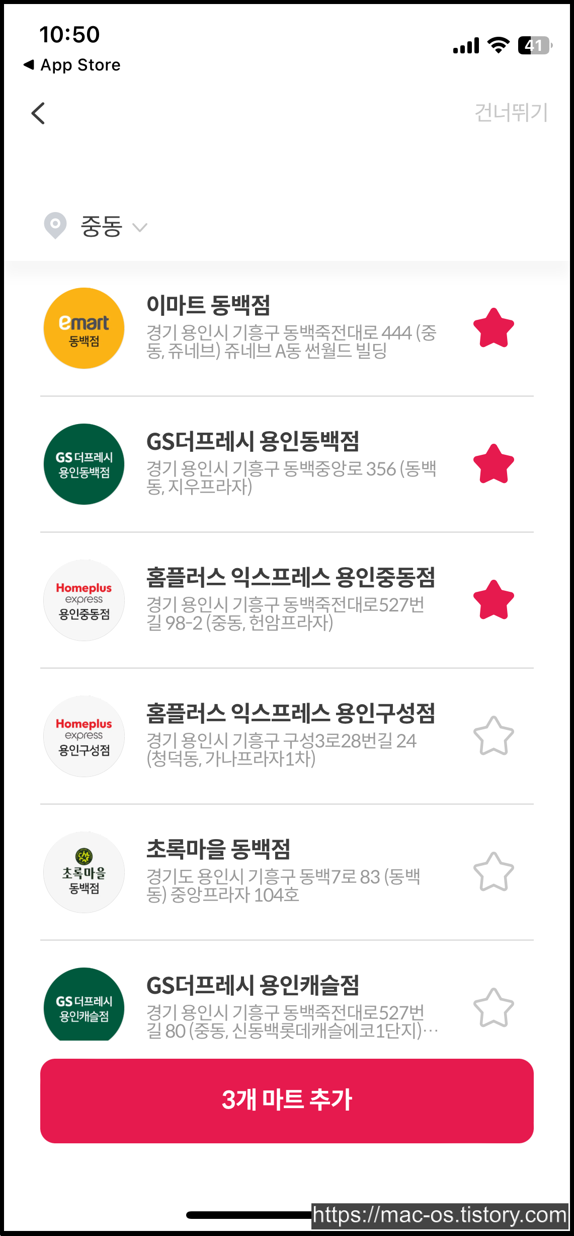 자신의 위치 주변에 있는 마트 중에서 단골가게를 설정할 수 있다. 마트를 추가하고 확인을 누른다.