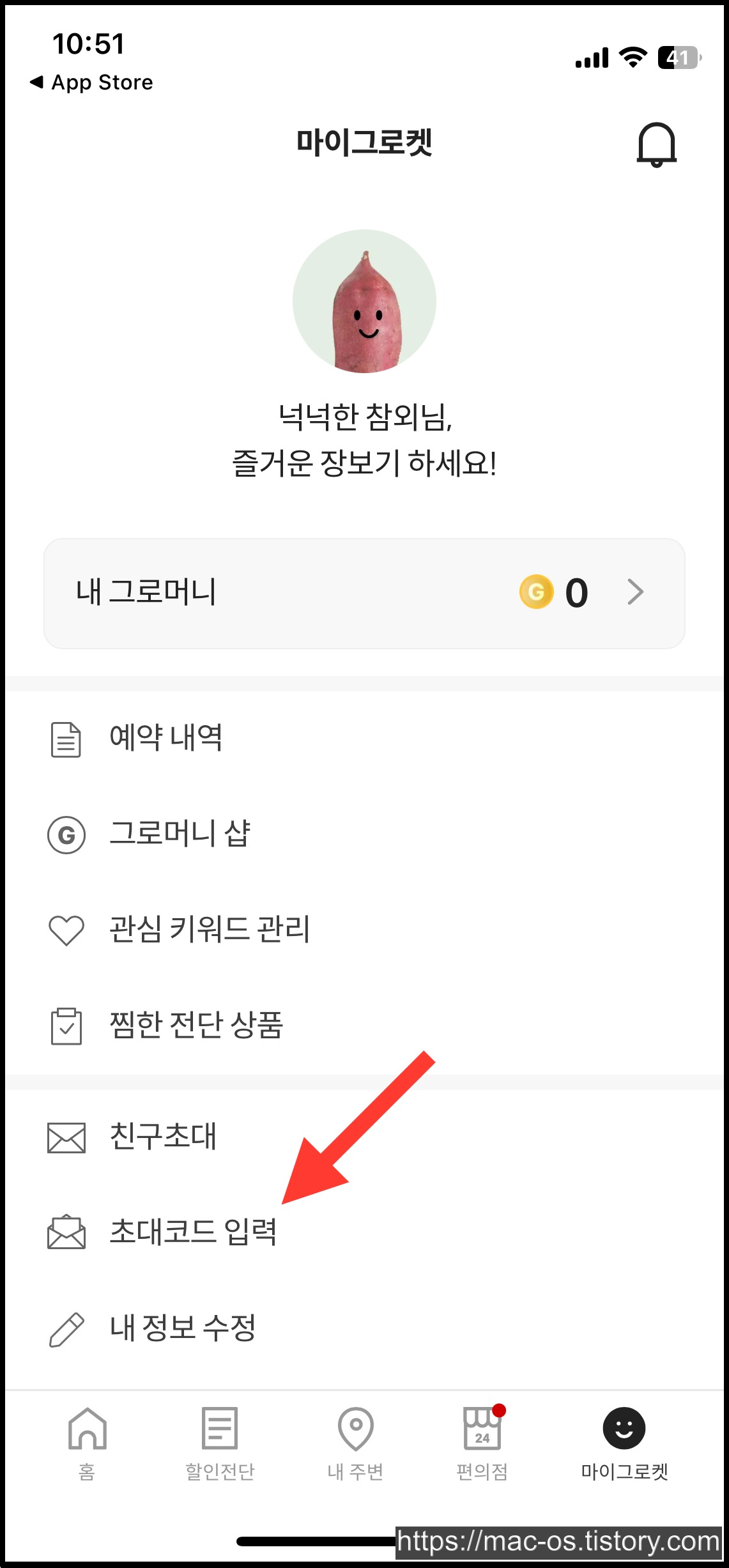우선 회원가입을 마친 뒤 우측 하단 [마이그로켓] 탭에서 [초대코드 입력]으로 이동한다.