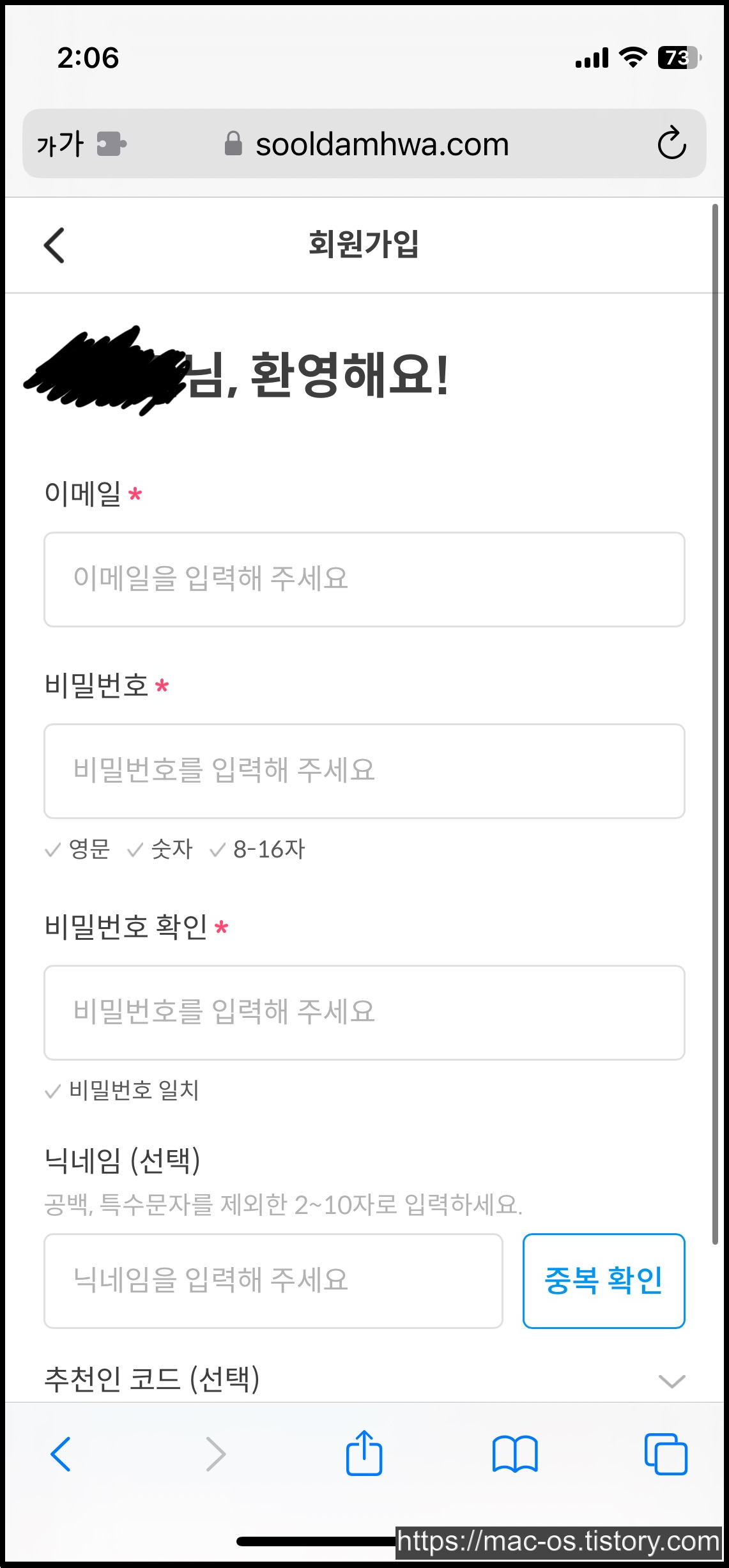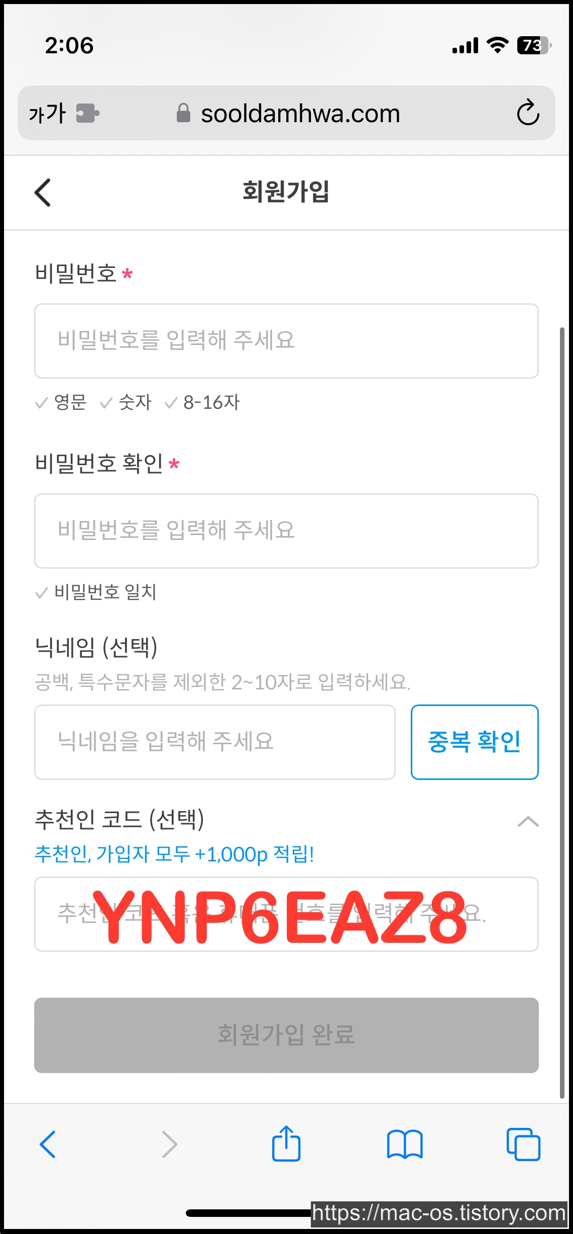 회원정보 입력 페이지 가장 아래에서 화살표를 누르면 추천인 코드를 입력할 수 있다. 술담화 추천인은 YNP6EAZ8을 입력하면 1000원을 추가로 준다.