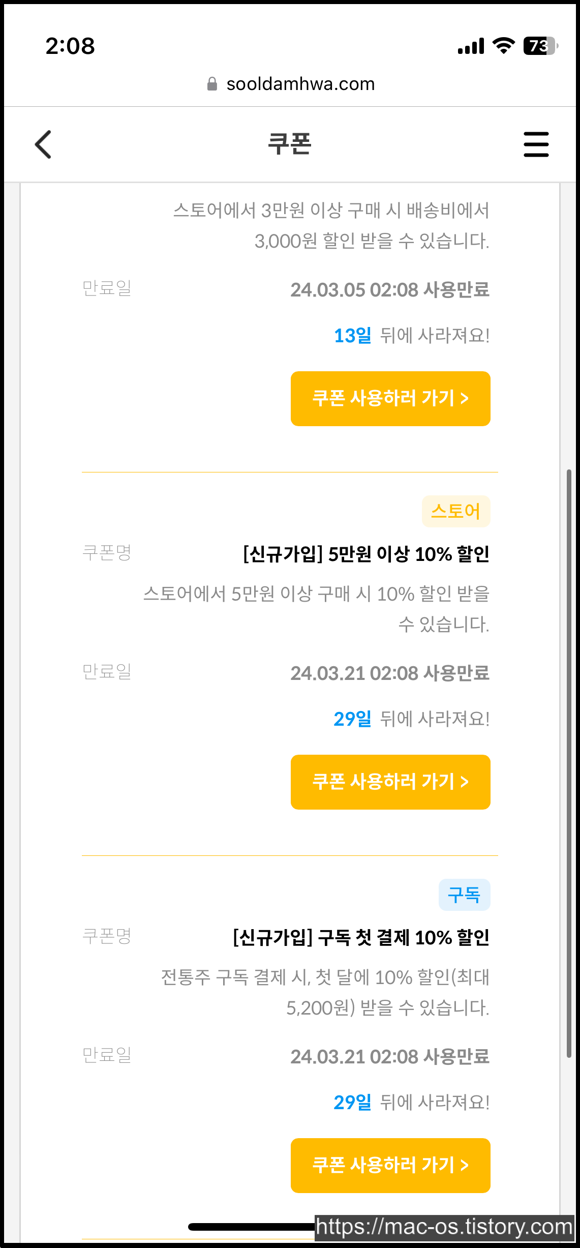 가입을 마치면 쿠폰 4장을 주는데, 배송비 무료 쿠폰과 5%, 10% 할인 쿠폰을 발급해준다.