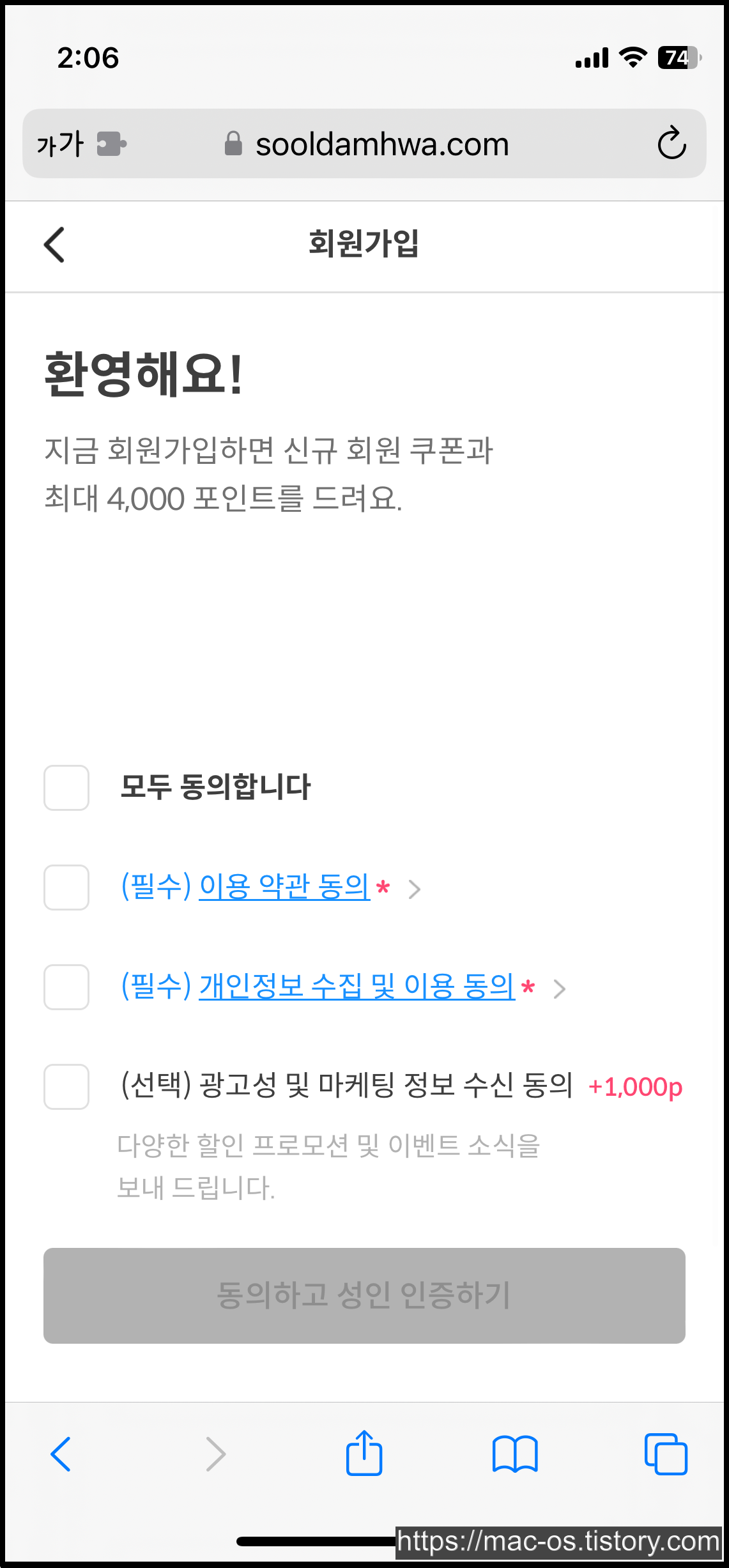 회원가입 버튼을 누르고 약관에 동의한다. 이때 광고성 및 마케팅 정보 수신동의에 체크하면 1000원을 받을 수 있다.