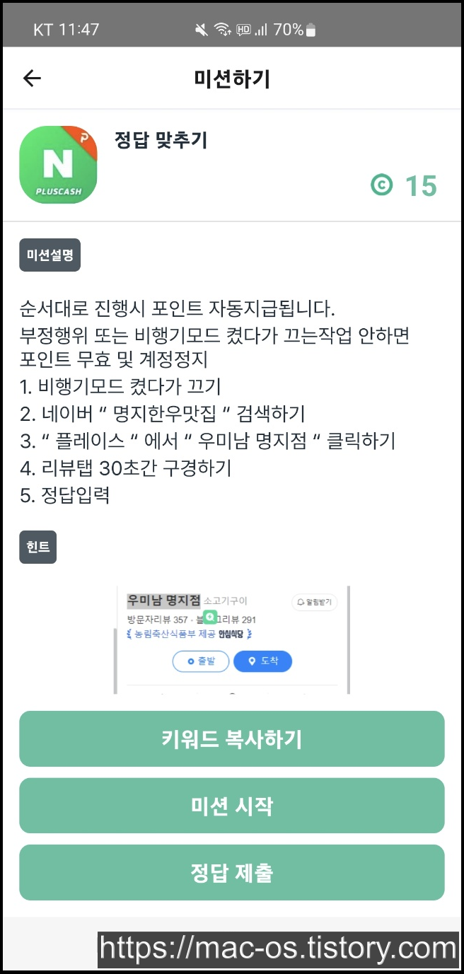 정답하기는 플레이스에서 정해진 장소를 클릭하고 리뷰탭을 30초간 구경한 다음 정답을 입력하는 미션이고, 저장하기를 플레이스를 저장한 다음 리뷰탭을 30초간 구경하고 적립 요청하면 되는 미션이다.