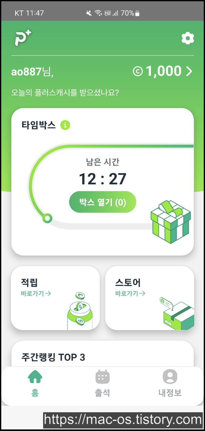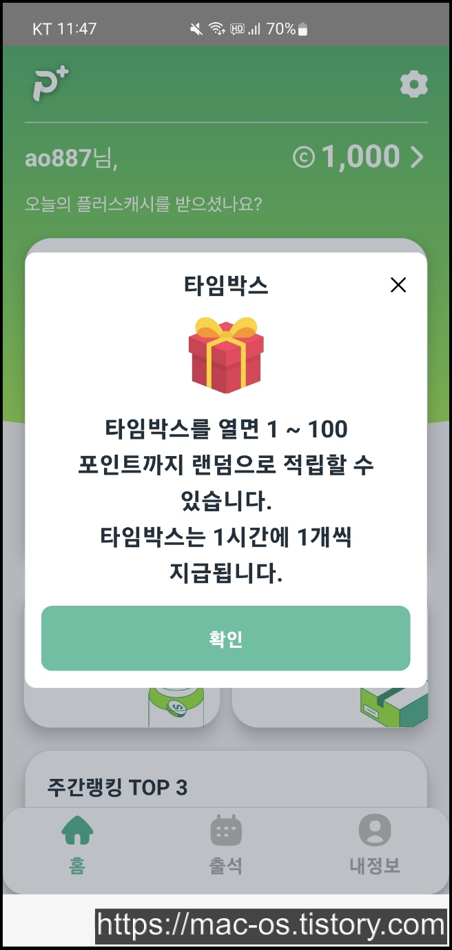 홈 화면을 보면 남은 시간이 있고, 타임박스라는 것이 있는데, 타임박스는 1시간마다 1개씩 지급되고 이걸 열면 최대 100포인트가 나온다고 한다.