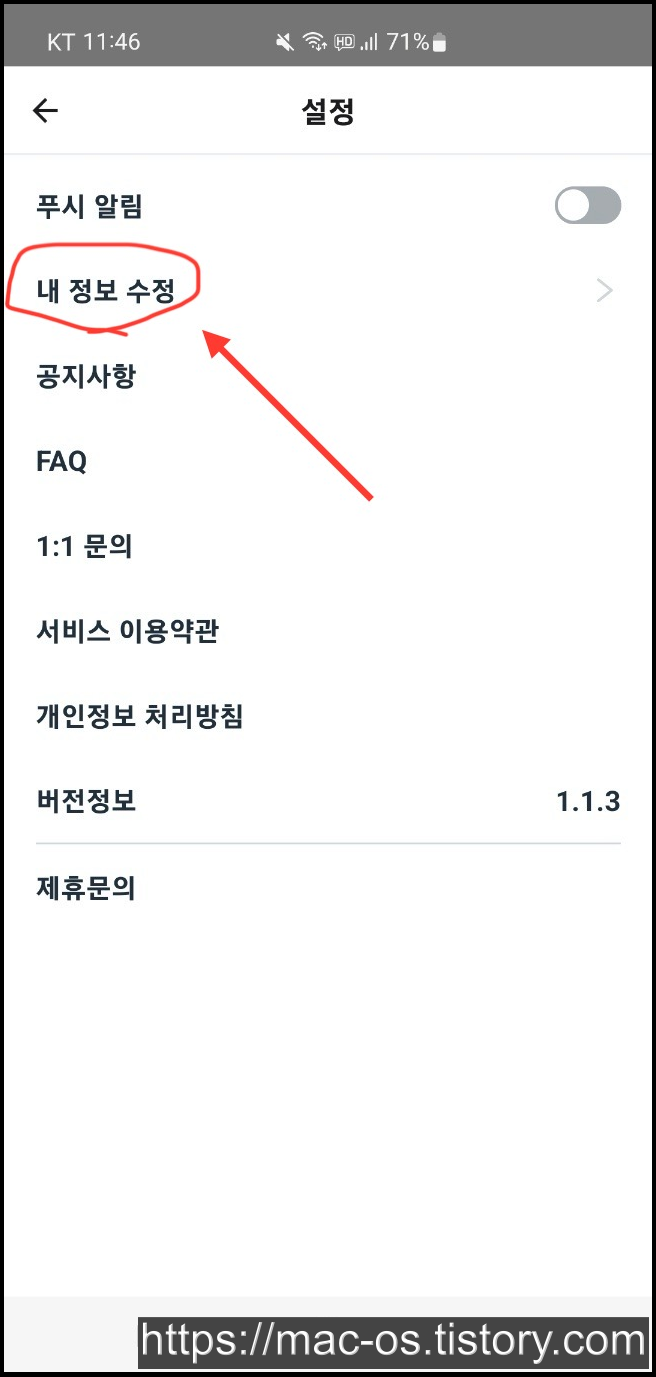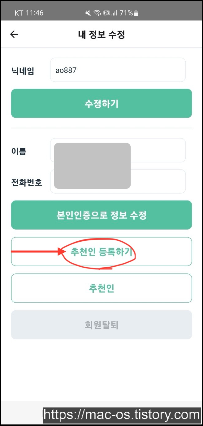 톱니바퀴 버튼을 누르면 설정 페이지로 이동하게 되는데, 여기서 내 정보 수정으로 들어가서 추천인 등록하기 버튼을 터치한다.