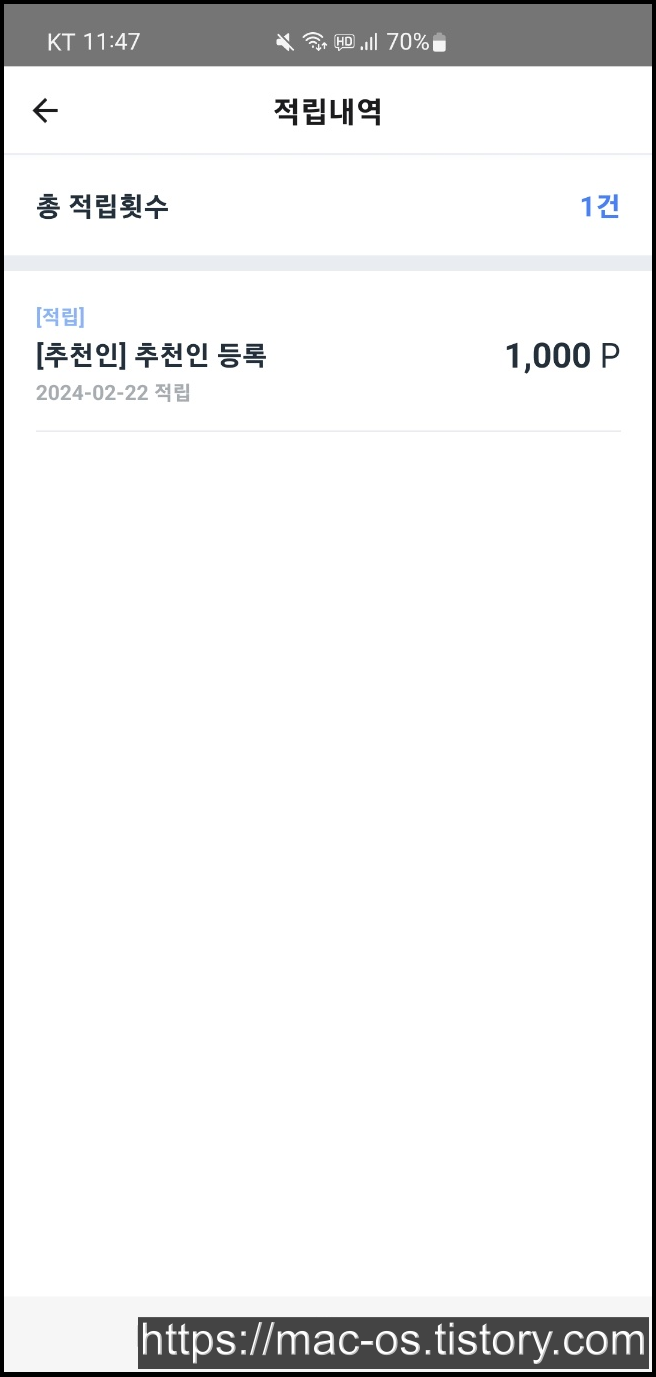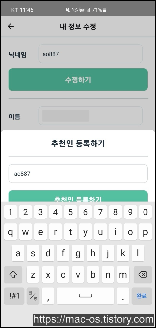 추천인 등록하기 창에서 ao887을 입력하면 1000원을 받을 수 있다.