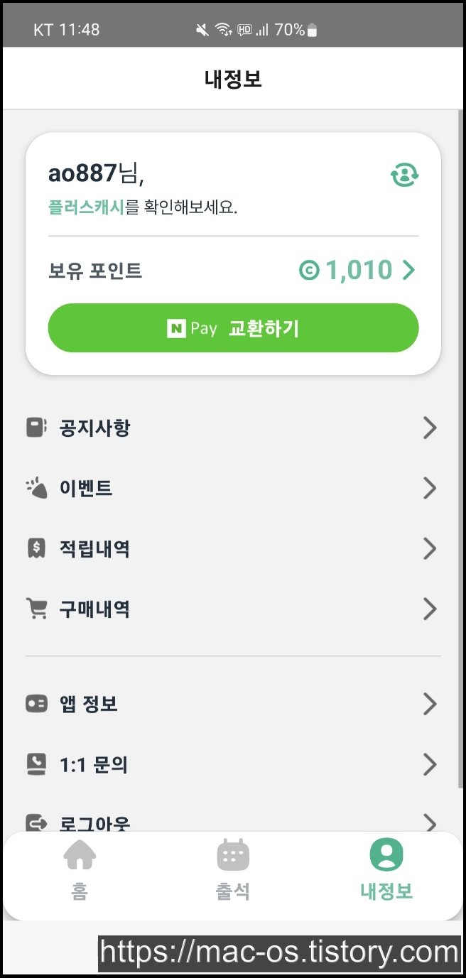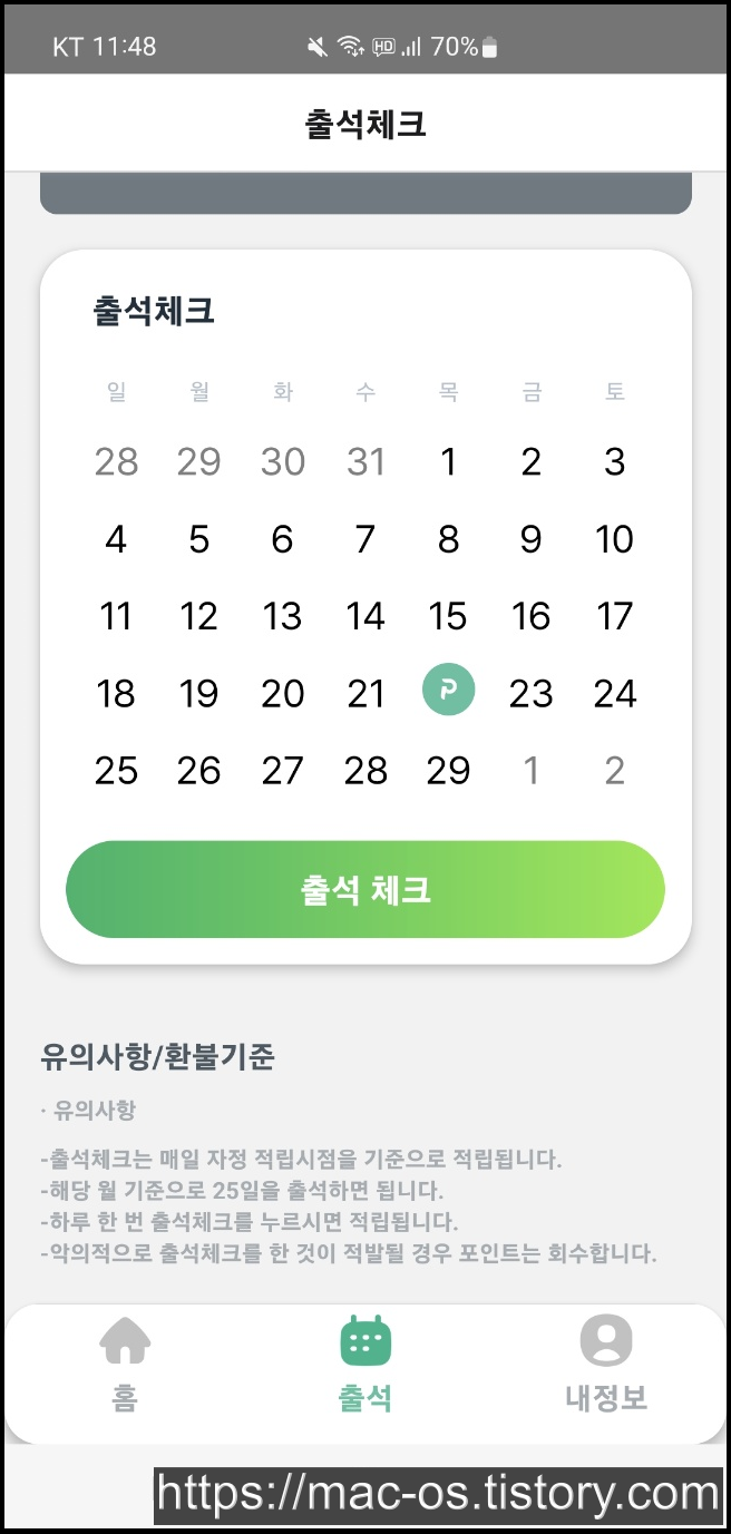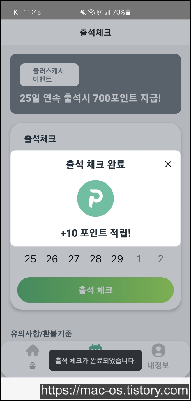 출석으로 이동해서 출석체크 버튼을 누르면 10포인트가 적립되고 25일 연속으로 출석하면 700포인트를 추가로 준다. 광고가 안나오기 때문에 출석만 하고 꺼도 괜찮은 앱이다.