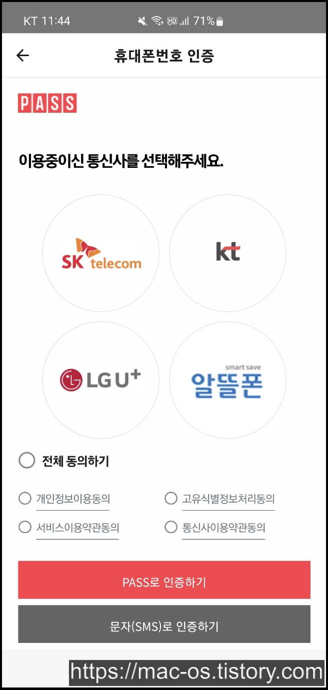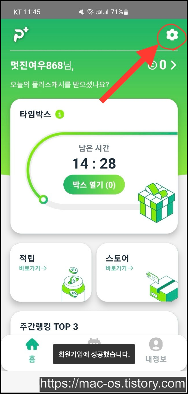 휴대폰 본인인증을 하면 가입이 완료되는데, 가입 후 홈 화면에서 우측 상단의 톱니바퀴를 누른다.
